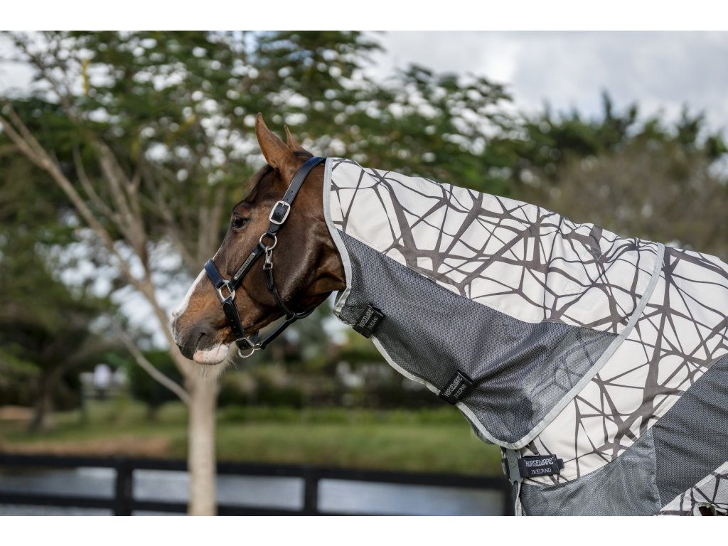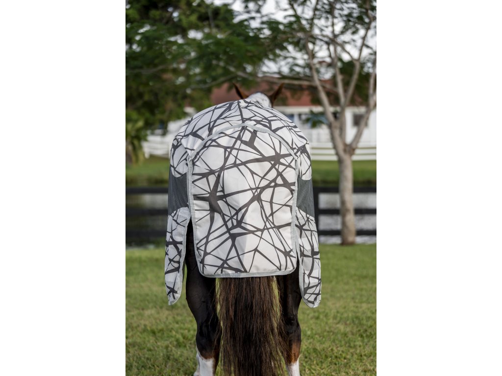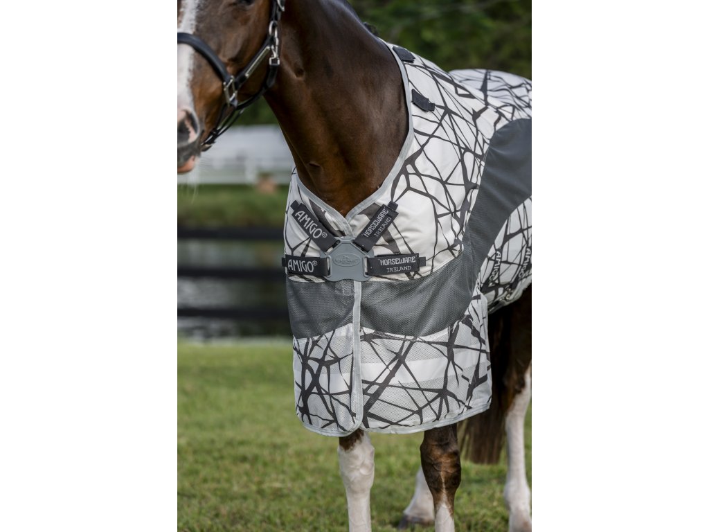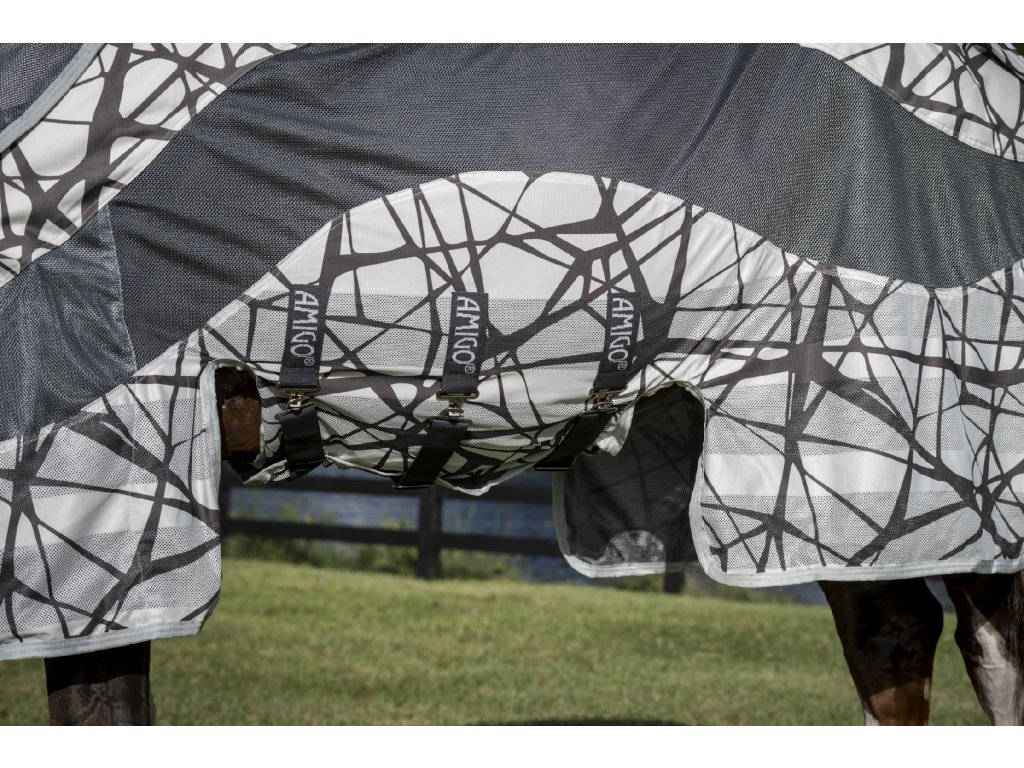 Unikátní deka CamoFly 3v1 Amigo poskytující výbornou ochranu před hmyzem, 65% ochranu před UV zářením a také ochranu před deštěm. Inovativní design prošel řadou výzkumů, které prokázaly, že zebří pruhy působí jako přirozený odstrašující prostředek a je pro hmyz matoucí. Vrstvené černé čáry na šedém pozadí působí na mouchy jako optický klam. Vzor rozbíjí tvar koně a hmyz ho následně nedokáže identifikovat jako cíl. Deka je vyrobena z vnějšího Ripstop polyesterového materiálu, který je odolný před roztržením (pevnost 600 D) a zároveň je nepromokavý. Boční panely jsou vyrobené z polyesterové síťoviny, která zajišťuje maximální prodyšnost. Deka je vybavena předním velmi praktickým a jednoduchým zapínáním na disk. Dále plným pokrytím břicha s trojitým křížovým zapínáním, popruhem pod ocasem, prodlouženou ochranou ocasu a také prodlouženým střihem v oblasti nohou. Dodávána včetně odnímatelného krčního dílu, jehož vrchní část je také nepromokavá.