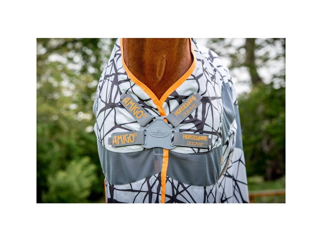 Unikátní deka CamoFly 3v1 Amigo poskytující výbornou ochranu před hmyzem, 65% ochranu před UV zářením a také ochranu před deštěm. Inovativní design prošel řadou výzkumů, které prokázaly, že zebří pruhy působí jako přirozený odstrašující prostředek a je pro hmyz matoucí. Vrstvené černé čáry na šedém pozadí působí na mouchy jako optický klam. Vzor rozbíjí tvar koně a hmyz ho následně nedokáže identifikovat jako cíl. Deka je vyrobena z vnějšího Ripstop polyesterového materiálu, který je odolný před roztržením (pevnost 600 D) a zároveň je nepromokavý. Boční panely jsou vyrobené z polyesterové síťoviny, která zajišťuje maximální prodyšnost. Deka je vybavena předním velmi praktickým a jednoduchým zapínáním na disk. Dále plným pokrytím břicha s trojitým křížovým zapínáním, popruhem pod ocasem, prodlouženou ochranou ocasu a také prodlouženým střihem v oblasti nohou. Dodávána včetně odnímatelného krčního dílu, jehož vrchní část je také nepromokavá.