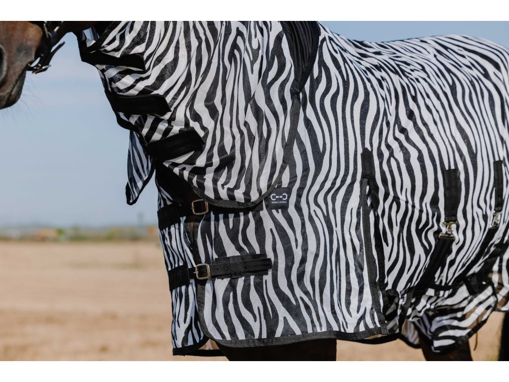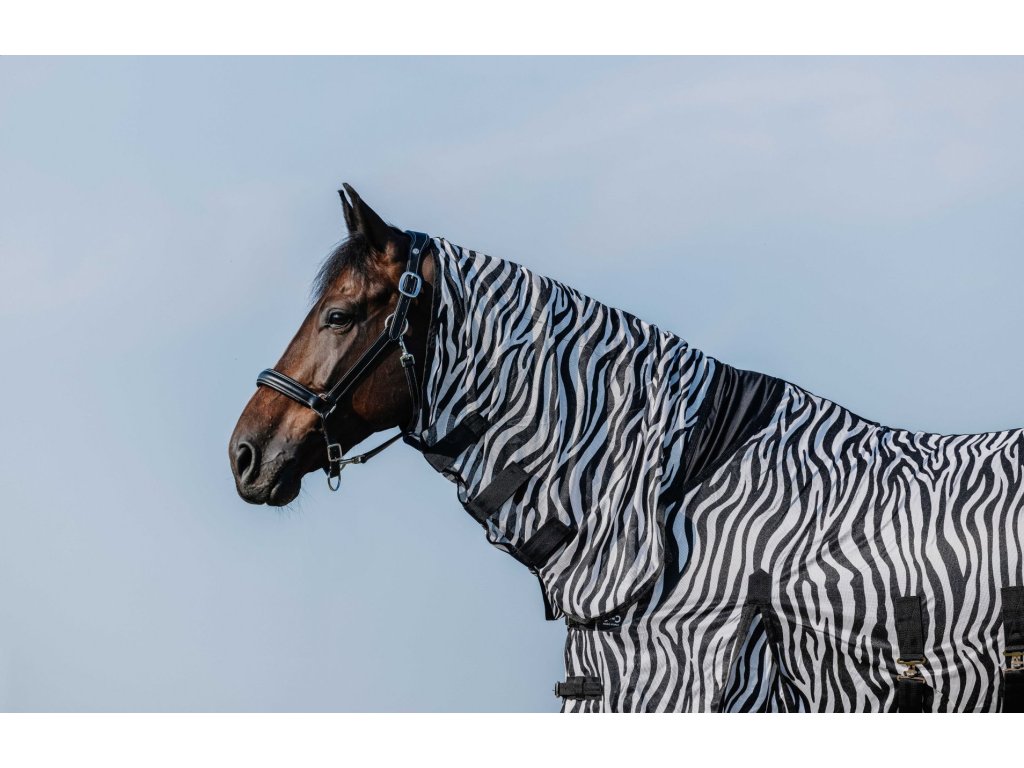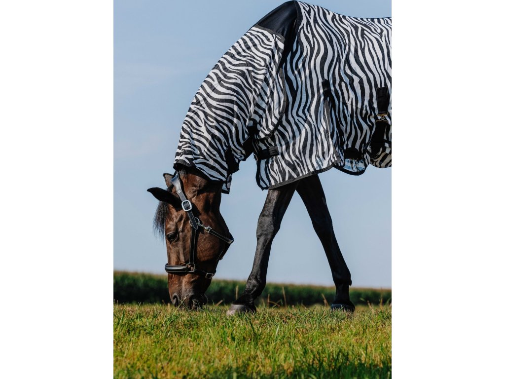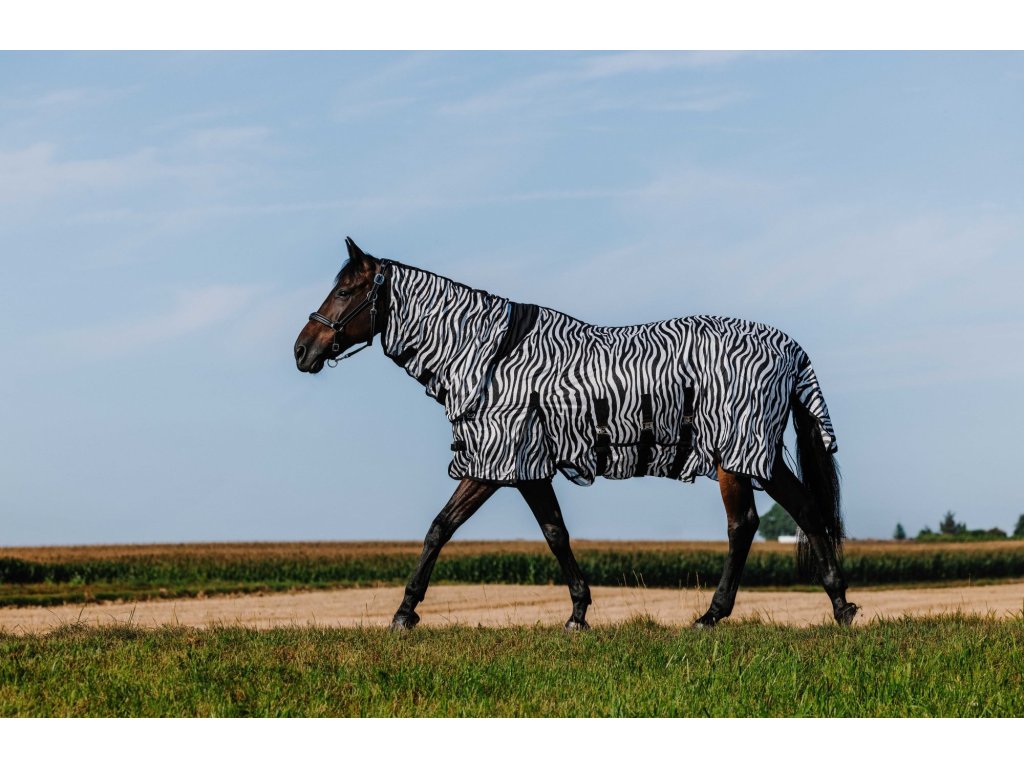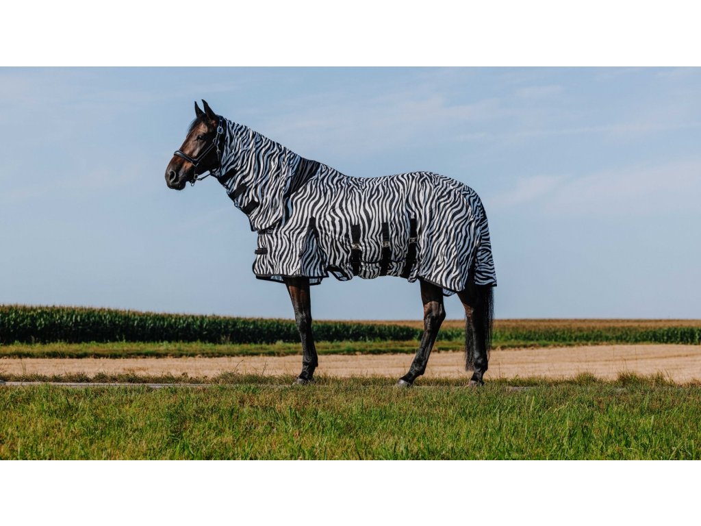 Kvalitní deka proti hmyzu s integrovaným krčním dílem pro maximální ochranu. Vyrobena z lehké a prodyšné síťoviny o gramáži 135 g/m². Černobílý vzor zebry poskytuje přirozenou ochranu proti hmyzu. Studie ukazují, že tento vzor snižuje atraktivitu koně pro některé druhy hmyzu. Krční díl je opatřen pružným materiálem typu lycra pro vyšší pohodlí při pohybu. Deka je vybavena dvojitým předním zapínáním, ramenními rozparky pro volnost pohybu, ochranou břicha se zapínáním na tři popruhy, prodlouženým krytem přes ocas. Ideální volba pro ochranu koně během teplých měsíců.