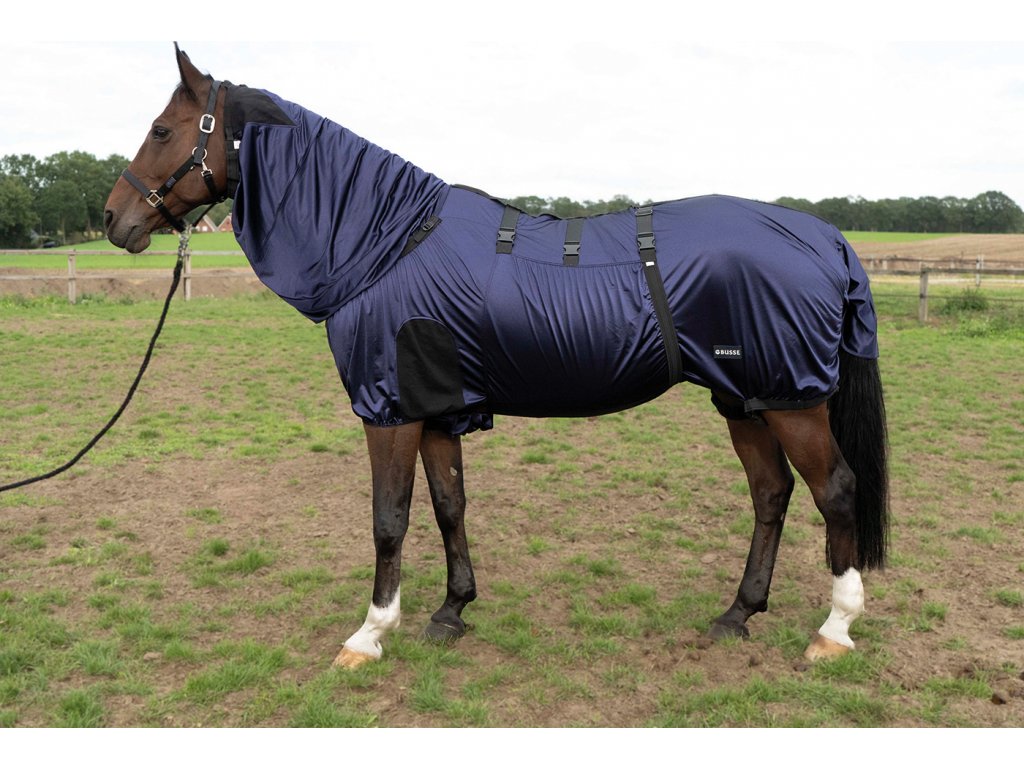 Deka proti hmyzu pro ekzematické koně s krčním dílem, překrytím břicha a ocasu. Prodyšná, funkční, pohodlná. Vyrobená z rychleschnoucího a odolného polyesterového materiálu, který odpuzuje nečistoty a vlhkost. Elastické části zajišťují komfort a pohyb bez omezení. Oblast kohoutku je podšitá fleecem, aby nedocházelo k jeho odírání. Zapínání pomocí nastavitelných elastických popruhů v oblasti břicha a zadních nohou. Extra velký chránič ocasu se zapínáním na suchý zip.