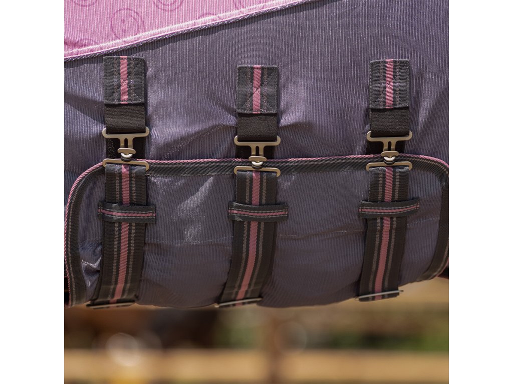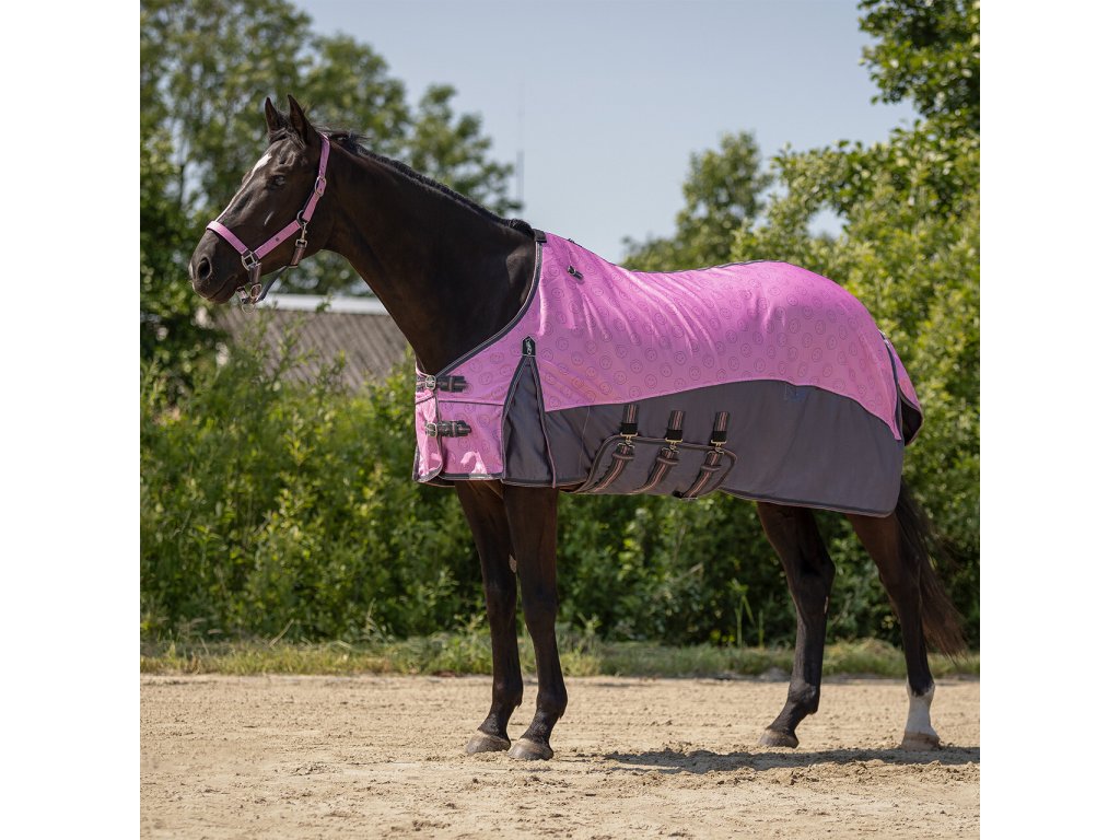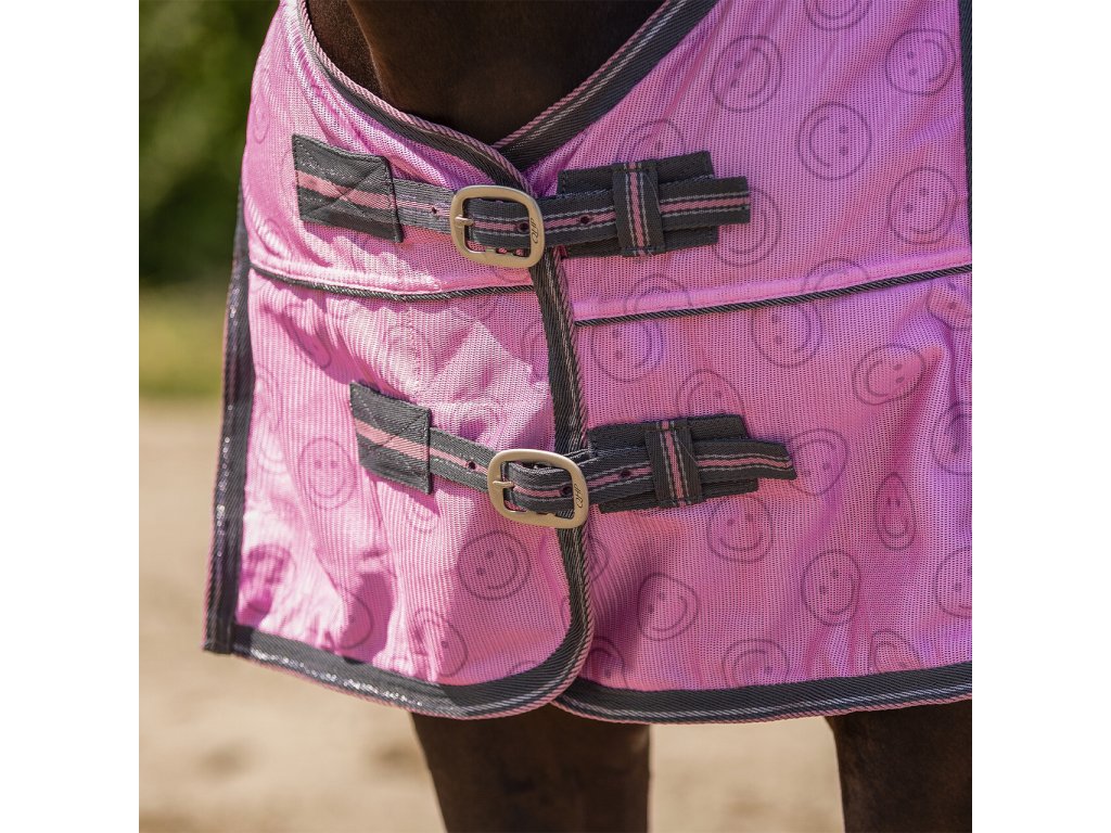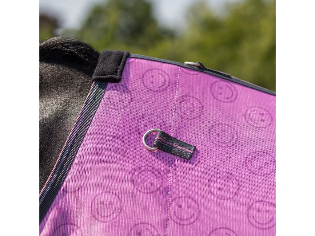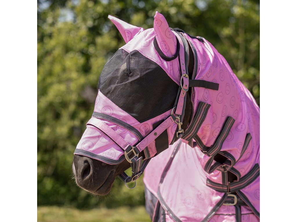 Deka proti hmyzu, která zaujme veselým potiskem smajlíků a zároveň spolehlivě chrání koně před hmyzem v letním období. Deka je dodávaná včetně odnímatelné masky a krčního dílu. Pro účinnou ochranu je deka vybavena břišním dílem se zapínáním na suchý zip a třemi elastickými popruhy. Maska je vyrobena z pevné síťoviny s výztuhou kolem očí. Krční díl má zapínání na suchý zip a lze snadno připnout k dece a masce. Dále je deka opatřena dvojitým předním zapínáním na přezky, předními rozparky, elastickými popruhy mezi nohy a popruhem pod ocas. Na prsou a v horní části krku je nylonová vložka pro snížení rizika odření. Vybavena je kvalitním kováním v černé barvě.