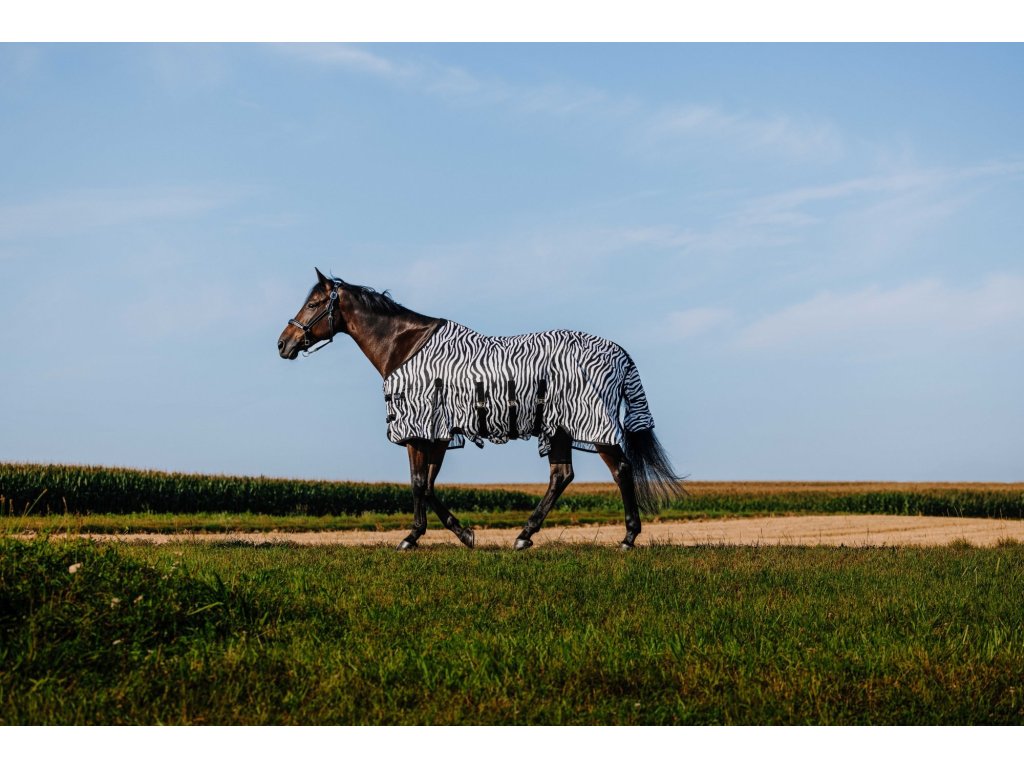 Kvalitní deka proti hmyzu pro maximální ochranu. Vyrobena z lehké a prodyšné síťoviny o gramáži 135 g/m². Černobílý vzor zebry poskytuje přirozenou ochranu proti hmyzu. Studie ukazují, že tento vzor snižuje atraktivitu koně pro některé druhy hmyzu. Deka je vybavena dvojitým předním zapínáním, ramenními rozparky pro volnost pohybu, ochranou břicha se zapínáním na tři popruhy a prodlouženým krytem přes ocas. Ideální volba pro ochranu koně během teplých měsíců.