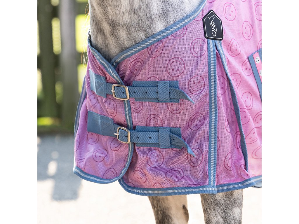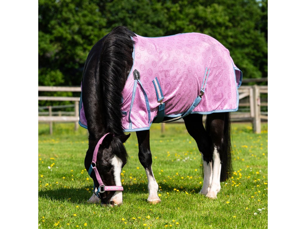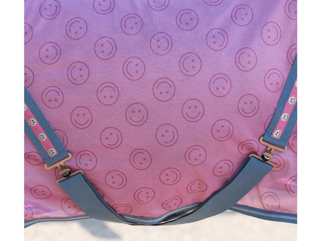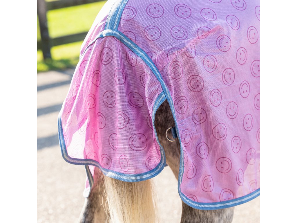 Deka proti hmyzu, která zaujme veselým potiskem smajlíků a zároveň poskytuje spolehlivou ochranu v letním období před hmyzem. Přední část je podšitá nylonovou vložkou, která zabraňuje odírání. Deka má dvojité přední zapínání na přezky, rozparky pro lepší pohyb, ochranu ocasu s popruhem a elastické křížové zapínání pod břichem. Lze prát v pračce na 30 °C, deku vyperte nejlépe v pracím sáčku. Vyhněte se aviváži a nesušte v sušičce.