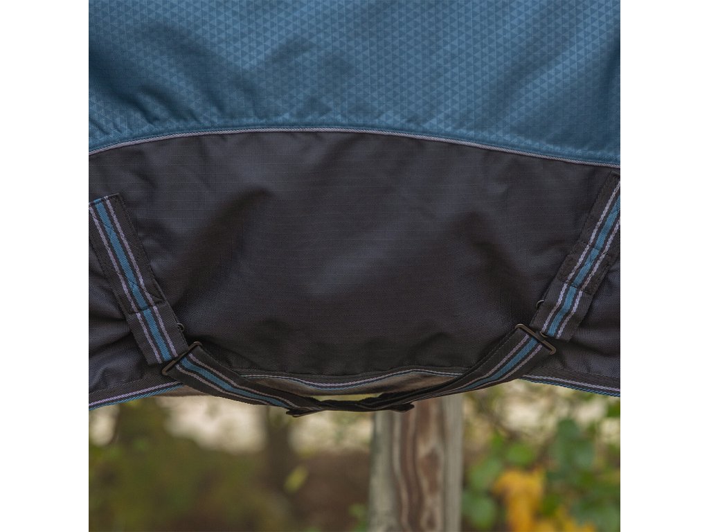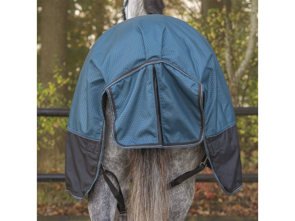 Velmi kvalitní výběhová deka se zateplením 150 g. Je vyrobena z pevného, prodyšného a nepromokavého materiálu s pevností 1200 D a vodním sloupcem 3000 mm/m², který udržuje koně v teple a suchu i během nepříznivého počasí. Deka je vybavena dvojitým předním zapínáním, křížovým zapínáním pod břichem s gumovými konci, popruhy mezi nohy a popruhem pod ocasem. Střih deky zahrnuje ramenní rozparky, měkký fleece v oblasti kohoutku a ochranu ocasu. V oblasti hrudníku je navíc nylonová vložka, která zabraňuje oděru. Díky prodlouženému střihu v oblasti hrudníku je deka vhodná i pro širší koně.