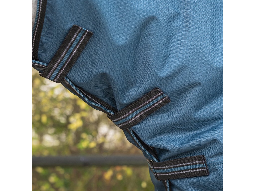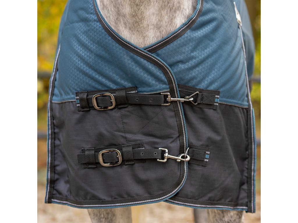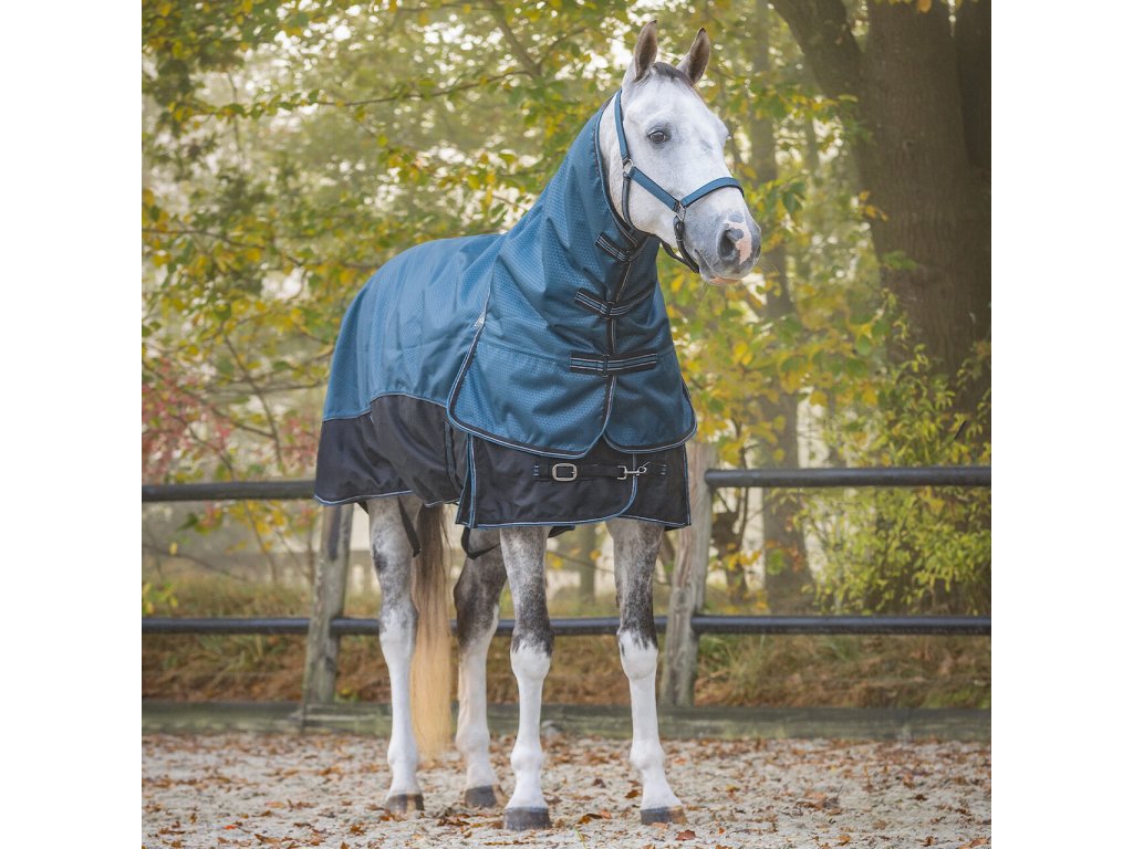Velmi kvalitní výběhová deka se zateplením 150 g a integrovaným krčním dílem. Je vyrobena z pevného, prodyšného a nepromokavého materiálu s pevností 1200 D a vodním sloupcem 3000 mm/m², který udržuje koně v teple a suchu i během nepříznivého počasí. Deka je vybavena dvojitým předním zapínáním, křížovým zapínáním pod břichem s gumovými konci, popruhy mezi nohy a popruhem pod ocasem. Střih deky zahrnuje ramenní rozparky, měkký fleece v oblasti kohoutku a ochranu ocasu. V oblasti hrudníku je navíc nylonová vložka, která zabraňuje oděru. Díky prodlouženému střihu v oblasti hrudníku je deka vhodná i pro širší koně.