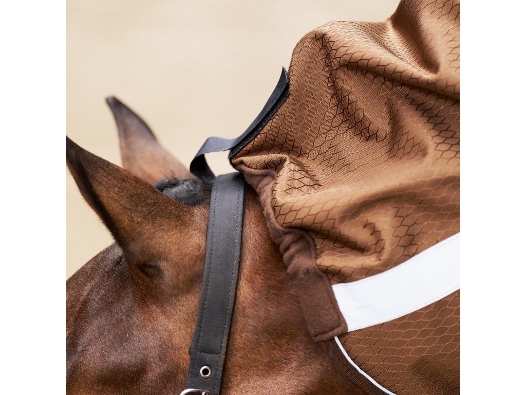Výběhová deka Super-Proof s vyšším krkem, odnímatelným krčním dílem a zateplením 200 g poskytuje spolehlivou ochranu před nepříznivým počasím a je vhodná pro každodenní používání. Je vyrobena z pevné a odolné tkaniny s pevností 1200 D a nabízí voděodolnost 3000 mm. Inovativní krční díl Armadillo zajišťuje volný a přirozený pohyb bez tlaku na hřívu či kohoutek a v případě potřeby jej lze snadno odepnout. Zakončení krčního dílu je navrženo tak, aby pevně drželo na místě a současně poskytovalo maximální pohodlí. V horní části se nachází suchý zip určený k připevnění k ohlávce, který zajišťuje stabilitu při pohybu, zatímco elastický okraj se přizpůsobí tvaru krku a účinně brání průniku větru či deště. Měkké polstrování minimalizuje riziko oděrek. Pro ještě vyšší komfort má deka měkké polstrování v oblasti hrudníku a plyšovou výstelku na krku. Křížové zapínání je vedeno skrze speciální otvory v dece, což zlepšuje její stabilitu a brání posunu i při intenzivnějším pohybu koně. Nechybí ani popruhy mezi zadní nohy, popruh pod ocasem a přední dvojité zapínání na karabiny. Celkový moderní vzhled podtrhuje elegantní metalický potisk, který je typickým podpisem značky Imperial Riding.