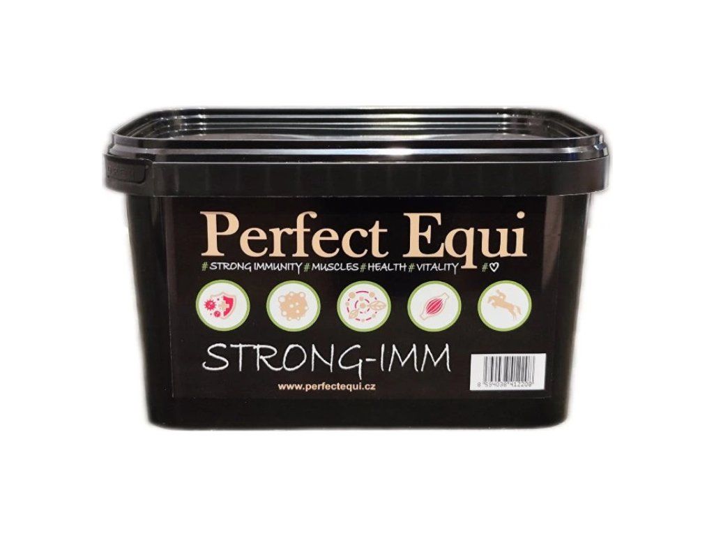 Extra porce podpory pro imunitní systém. Perfect Equi STRONG-IMM je krmný doplněk na podporu imunitního systému, zdraví a celkové vitality koní. Obsahuje biologicky výborně dostupné živiny, které s přidanými betaglukany podporují odolnost organismu proti bakteriálním, virovým, plísňovým i parazitárním onemocněním a také mohou být skvělou podporou při prevenci nebo výskytu nádorového onemocnění. STRONG-IMM je velmi vhodné užívat nejen při oslabené imunitě, ale také při zvýšené fyzické či psychické zátěži (stresu). Hmotnost balení 1,5 kg.