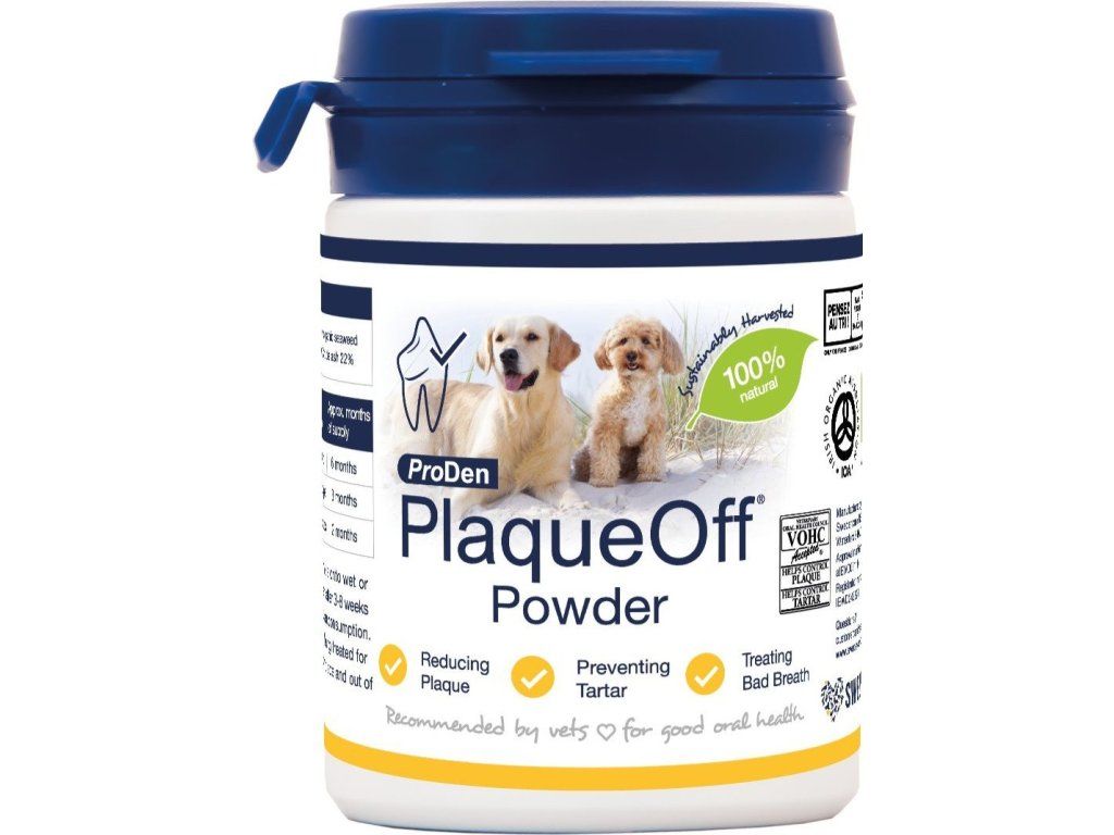 Doplněk krmiva pro psy. Podpora zdravých zubů a dásní a redukce zápachu z ústní dutiny. Mnoho psů a koček trpí problémy souvisejícími se zdravím ústní dutiny. Dobrá kondice ústní dutiny je přitom důležitá pro celkovou pohodu domácích mazlíčků. S ProDen PlaqueOff® si hned od začátku snadno vytvoříte zdravé návyky v péči o ústní dutinu vašich domácích mazlíčků. ProDen PlaqueOff® pomáhá udržovat čistý dech a čisté zuby psů po celý jejich život, od malého štěněte až po seniorský věk. Jedinečná složka mořských řas A.N ProDen® je 100% organická a přírodní. ProDen PlaqueOff® má klinicky prokázaný pozitivní účinek a je doporučován veterináři. A.N ProDen® se sklízí udržitelným způsobem v čistých vodách u skandinávského pobřeží a neobsahuje žádné přísady, takže je pro Vašeho mazlíčka zdravý a bezpečný. Pravidelné každodenní používání podle pokynů pomůže snížit a kontrolovat plak, zubní kámen a osvěžit dech. Výsledky jsou obvykle vidět po 3 až 8 týdnech pravidelného užívání.