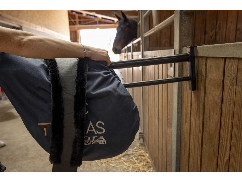 Odnímatelný držák na sedlo je vybaven druhým ramenem, které je ideální pro zavěšení podsedlové dečky a podporuje její lepší větrání a schnutí. Díky odnímatelnému provedení je držák snadno přenosný a flexibilní při použití v různých prostorách stáje.