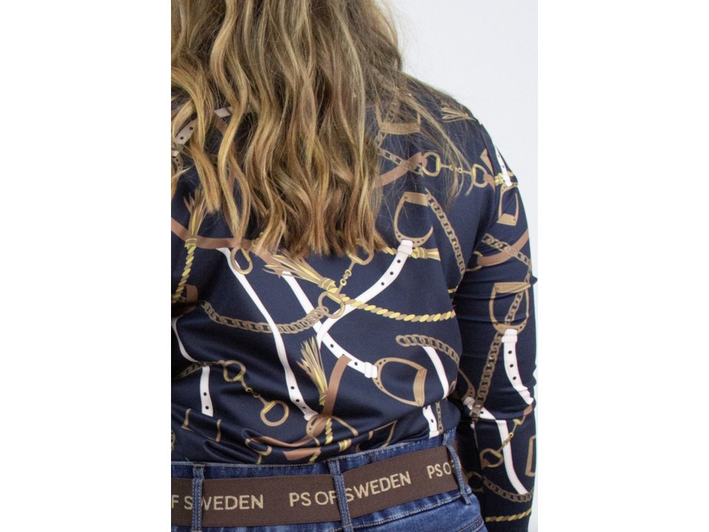 Elegantní košile vyrobena z měkkého a pružného žerzeje, který zajišťuje komfort během jízdy na koni. Vyráběna v plus-size velikostech. Košili lze využít i na běžné nošení. Košile je zdobena celoplošným vzorem jezdecké tématiky a zapínání je vyřešeno polovičním zapínáním pomocí knoflíků s monogramem PS. Doporučujeme prát na 40 °C.