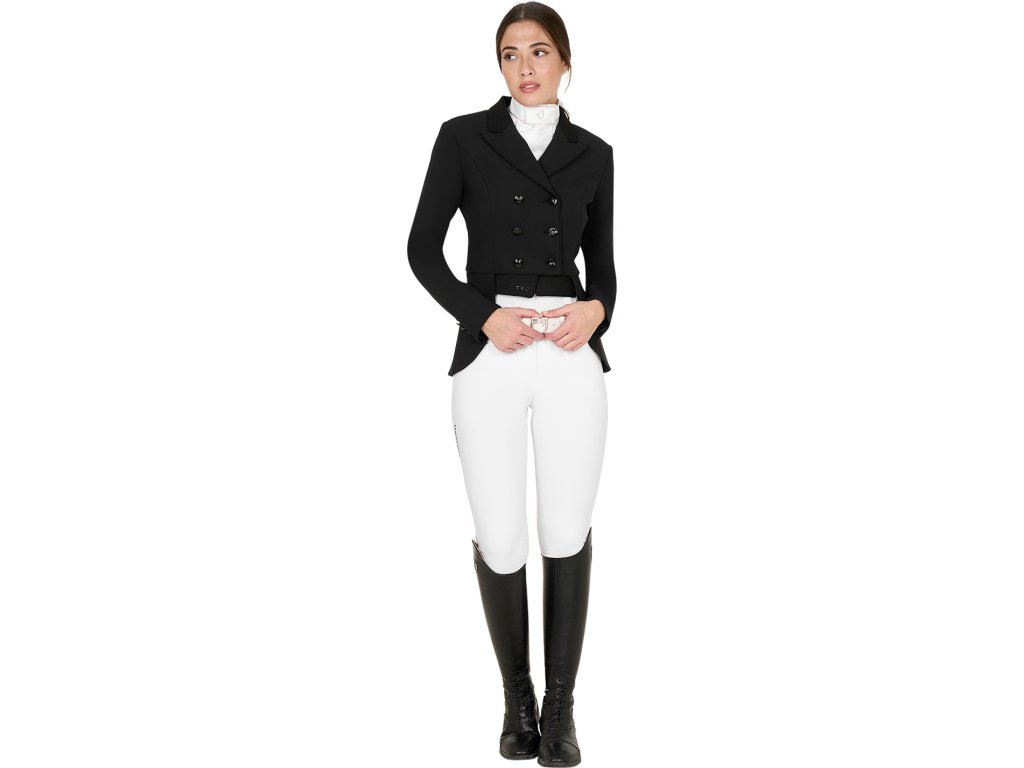 Dámský slim fit frak vyrobený z vysoce kvalitních technických tkanin, které poskytují jedinečné pohodlí, volnost pohybu a prodyšnost. Dvouřadý model je vybaven šesti knoflíky pro elegantní zapínání, zatímco manžety jsou zdobeny třemi knoflíky. Krátké klopy polovičního fraku zajišťují maximální stabilitu při výkonu. Oděv kombinuje ergonomický design ideální pro sportovní použití s výraznou elegancí Equestro.