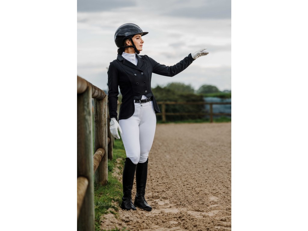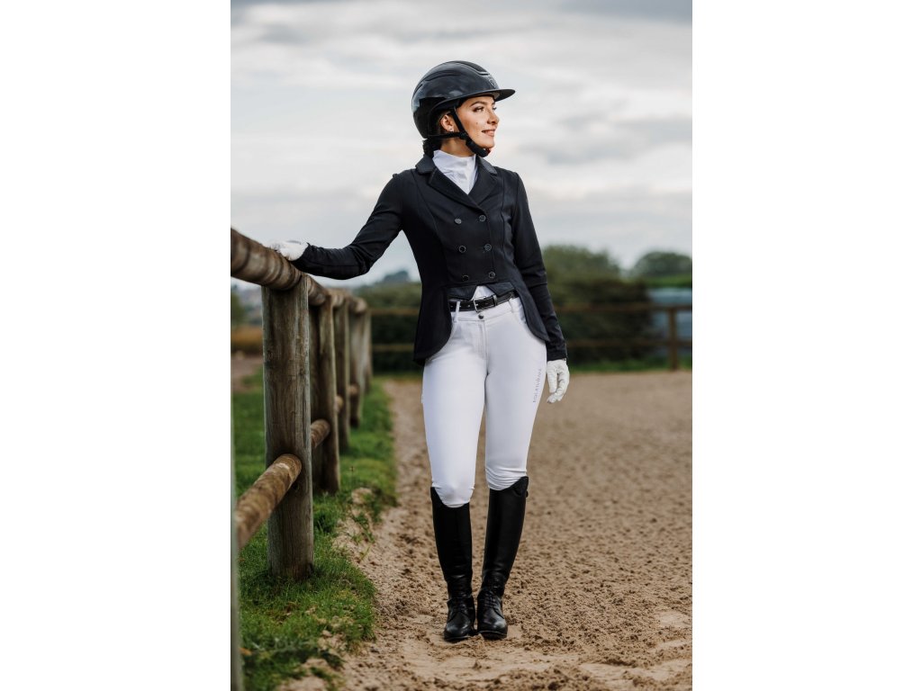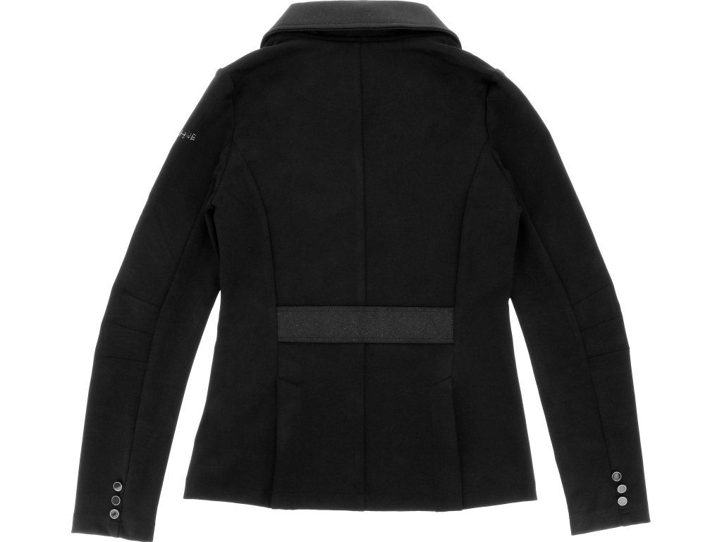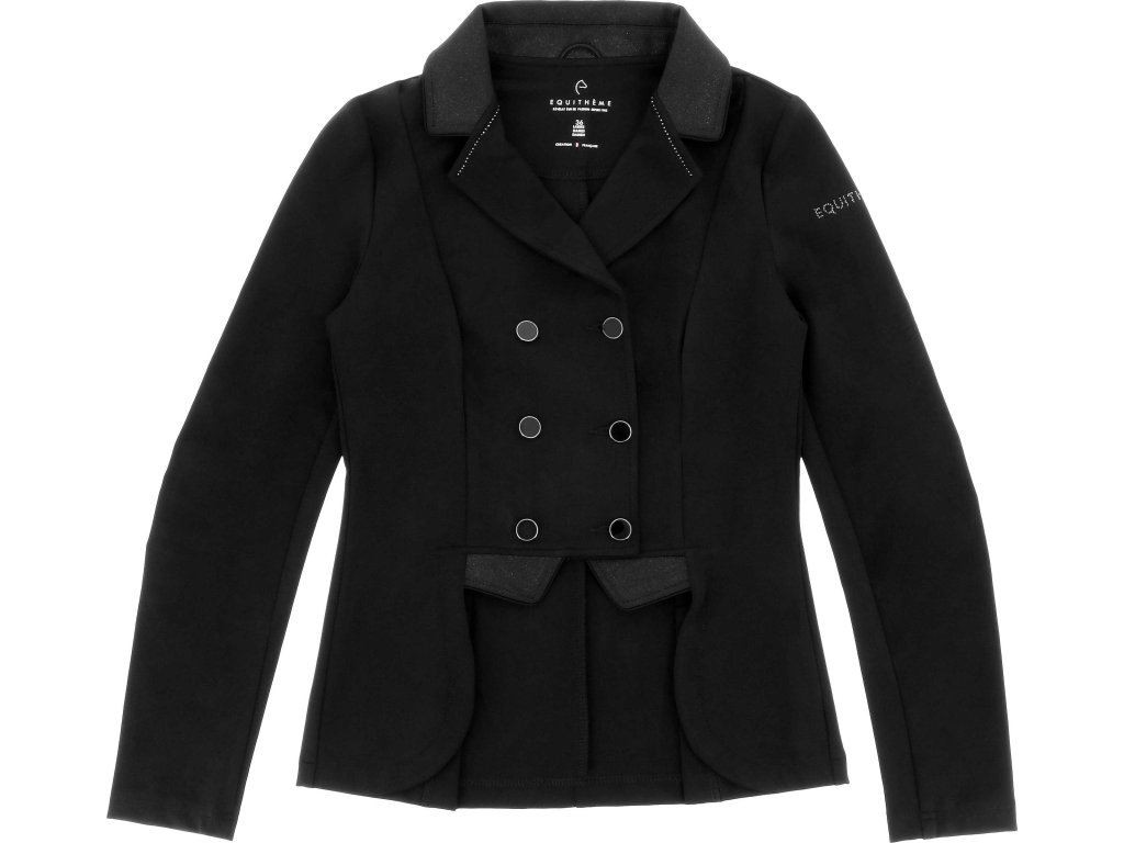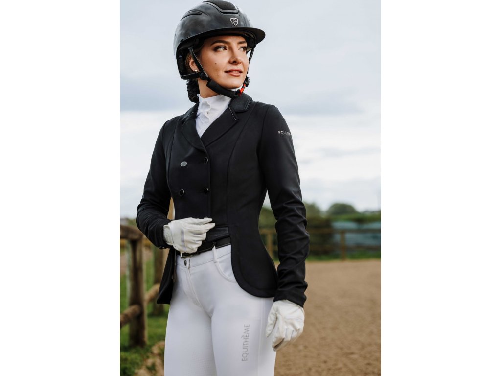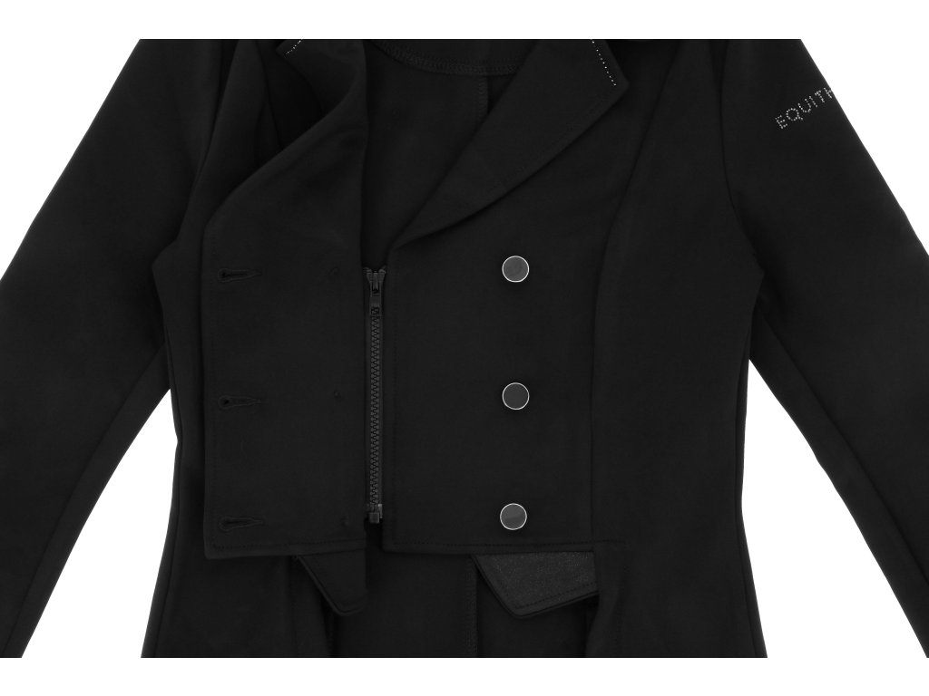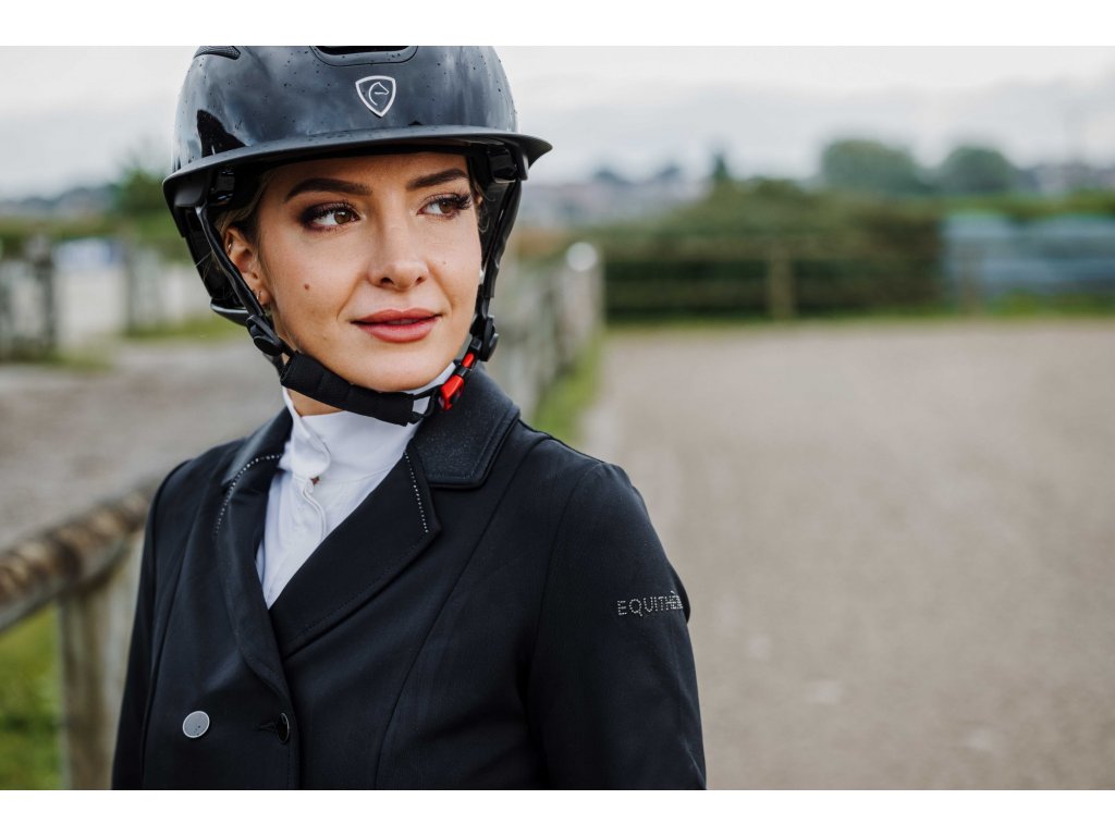 Tento elegantní závodní frak je vyroben ze strečového a prodyšného materiálu se čtyřsměrnou elasticitou, která zajišťuje maximální volnost pohybu a rychlé schnutí. Lehká tkanina s UV ochranou poskytuje optimální pohodlí i během slunečných dnů. Frak má zapínání na tři knoflíky, krátkou přední a prodlouženou zadní část pro moderní siluetu a dvojitý zip pod knoflíkovou légou pro perfektní držení tvaru. Na rukávu je decentně umístěn znak Equithème. Límec je zdoben decentními třpytky a kamínky.