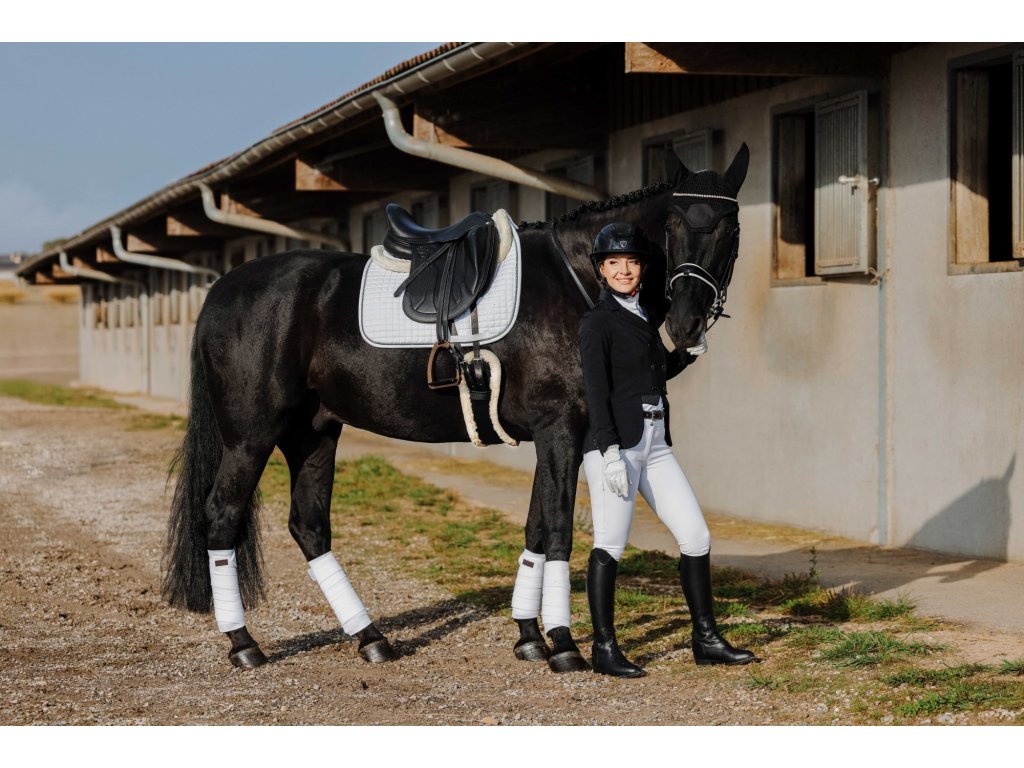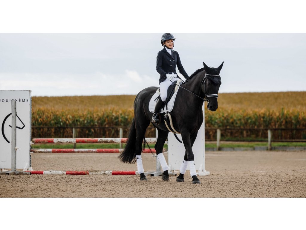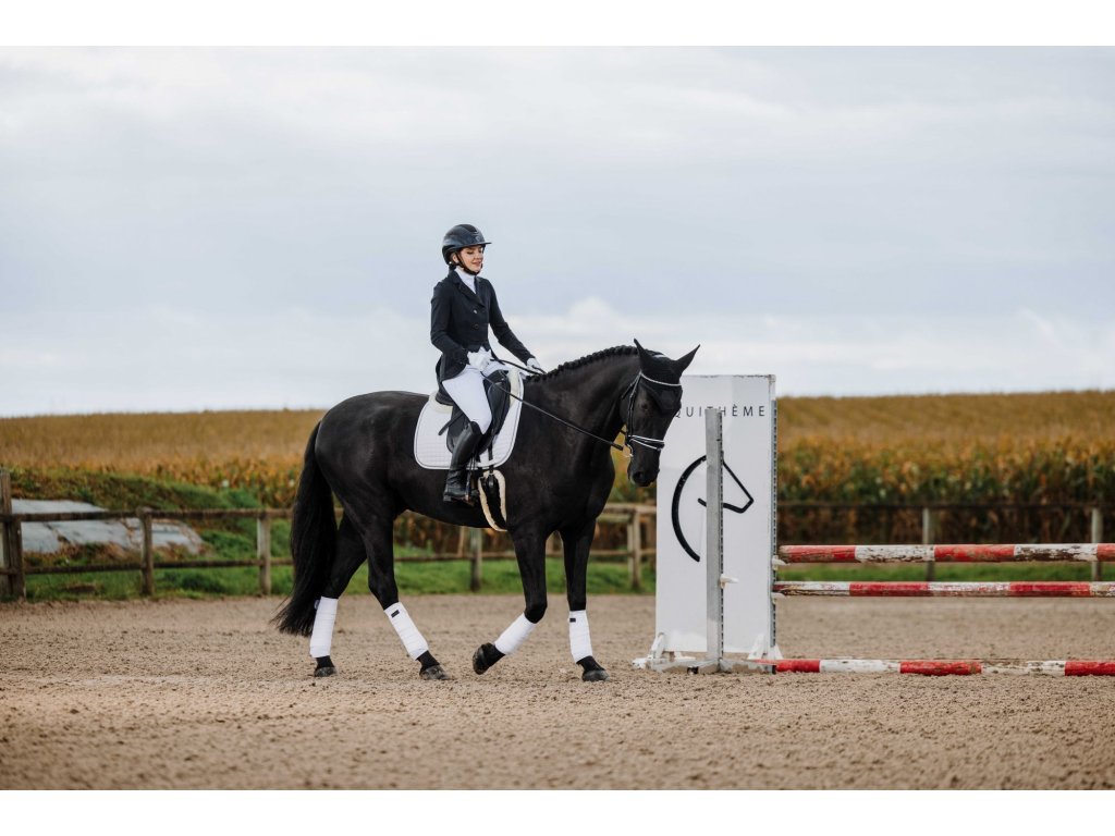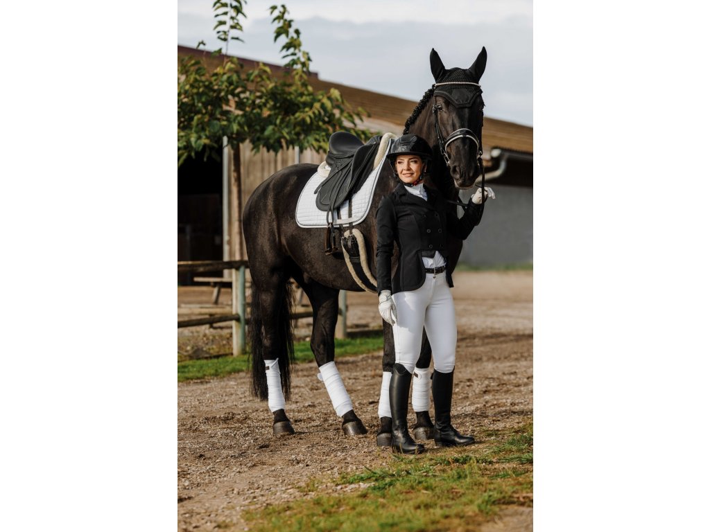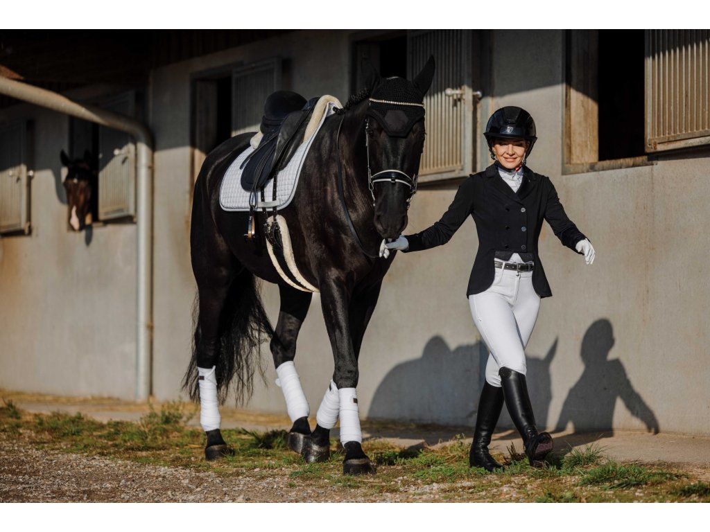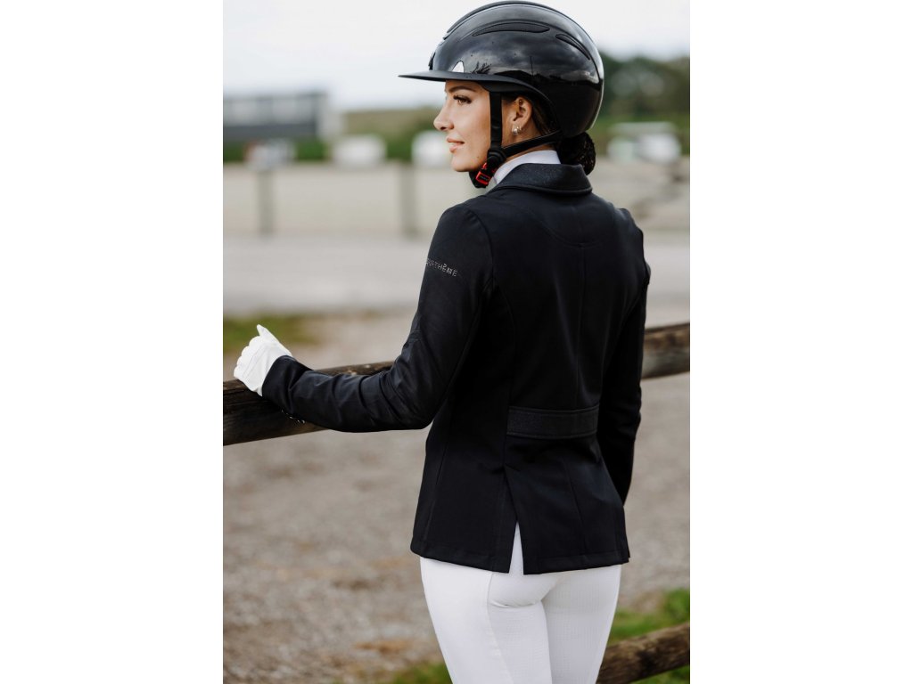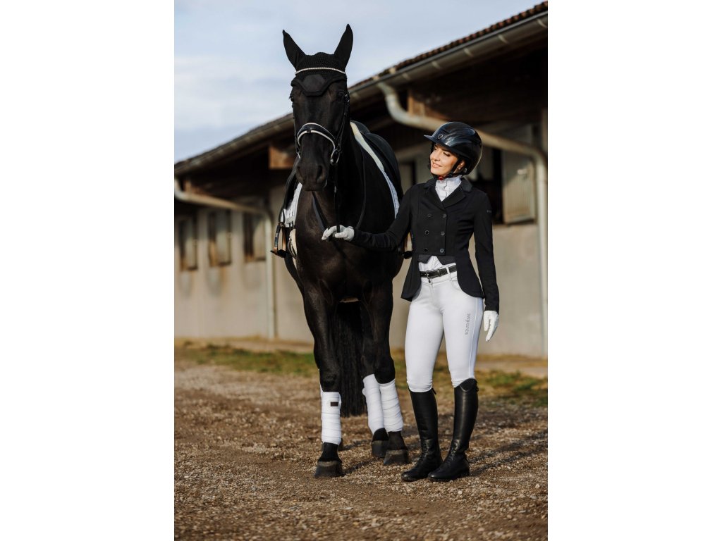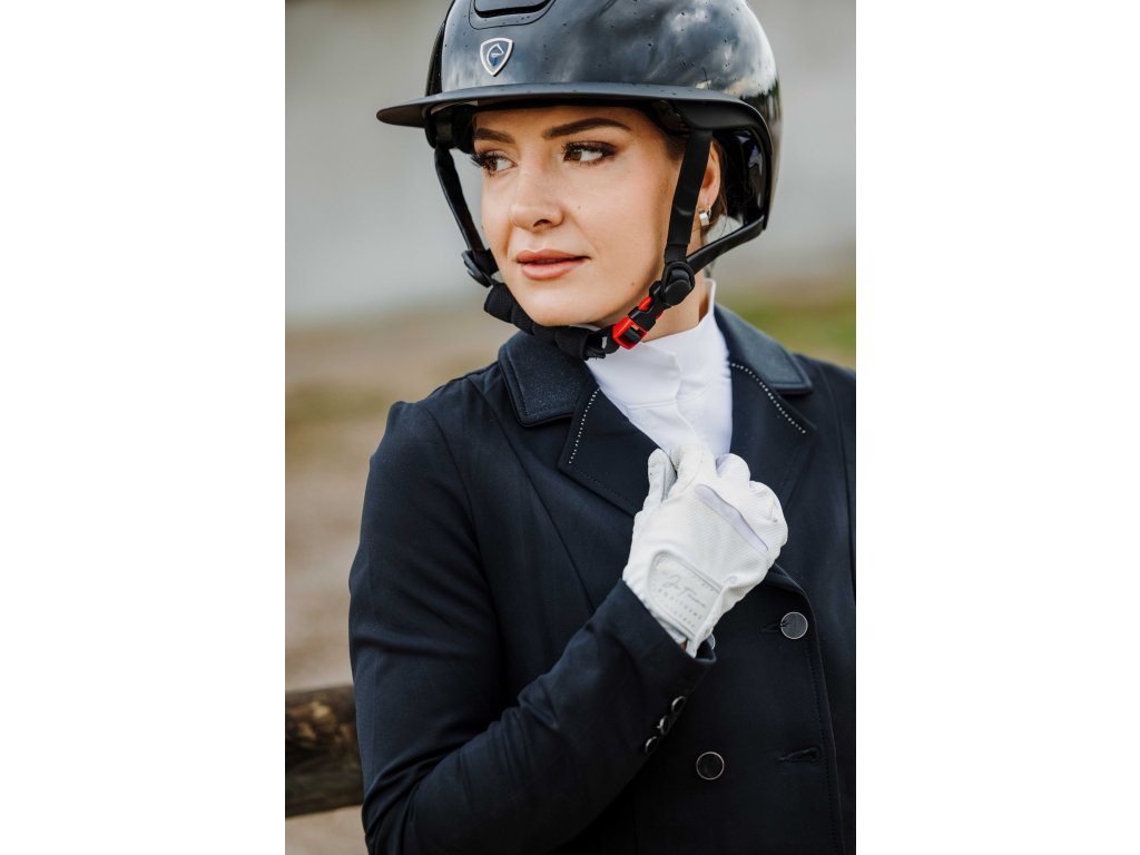 Tento elegantní závodní frak je vyroben ze strečového a prodyšného materiálu se čtyřsměrnou elasticitou, která zajišťuje maximální volnost pohybu a rychlé schnutí. Lehká tkanina s UV ochranou poskytuje optimální pohodlí i během slunečných dnů. Frak má zapínání na tři knoflíky, krátkou přední a prodlouženou zadní část pro moderní siluetu a dvojitý zip pod knoflíkovou légou pro perfektní držení tvaru. Na rukávu je decentně umístěn znak Equithème. Límec je zdoben decentními třpytky a kamínky.
