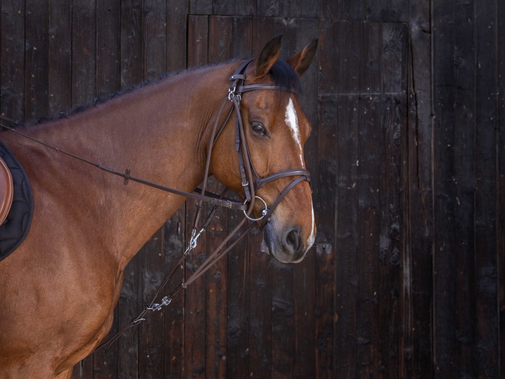 Lonžovací pomůcka se všemi potřebnými komponenty pro upevnění k nátylníku a obřišníku či podbřišníku. Gogue je speciální pomocná otěž určená především pro tvarování a práci s krkem koně. Působí na tři hlavní body - krk, hubu a týl koně. Vybavený karabinami z nerezové oceli. Vyroben z kvalitní bůvolí kůže.