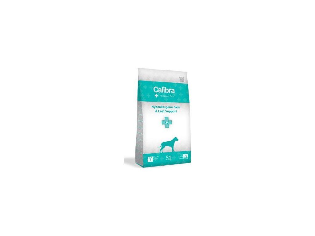 Calibra VD Dog Hypoallergenic Skin & Coat Support. Kompletní dietní krmivo pro psy. Jedná se o veterinární, dietní krmivo, které pomáhá při léčbě specifických onemocnění. Před použitím nebo před prodloužením doby používání se doporučuje vyžádat si stanovisko veterinárního lékaře. Podpora zdravé kůže a srsti: vybraný zdroj proteinu: losos: v kombinaci s hydrolyzovaným lososem, vybraný zdroj sacharidů: bramborový škrob. Skin & coat complex – speciální kombinace pro zmírnění klinických příznaků v důsledku dermatitidy: vitamíny & antioxidanty (polyfenoly a flavonoidy ze zeleného čaje a kurkumy), vysoká koncentrace omega 3 (zdrojem je lososový olej a řasy), obohaceno o biotin a organické minerály. Účel použití: management klinických symptomů (dermatologických nebo gastrointestinálních) způsobených nežádoucí reakcí na krmení, podpůrná terapie při léčbě dermatitidy, dermatózy, otitidy, alopecie nebo špatné kvality srsti, dlouhodobé použití na celoživotní management po eliminační dietě, eliminační dieta. Složení: bramborový škrob (50 %), lososový protein (22 %), hydrolyzovaný lososový protein (12 %), kuřecí tuk (9 %, konzervováno tokoferoly), sušená jablka, lososový olej (2 %), řasy (1 %, Schizochytrium limacinum), frukto-oligosacharidy (220 mg/kg), betaglukany (200 mg/kg), mannan-oligosacharidy (180 mg/kg), Yucca schidigera (150 mg/kg), extrakt z kurkumy a zeleného čaje bez kofeinu (zdroj flavonoidů 160 mg/kg a polyfenolů 80 mg/kg), Lactobacillus acidophilus HA – 122 inaktivovaný (15 x 109 buněk/kg). Zdroj bílkovin: losos. Zdroj sacharidů: brambory. Obsahuje přírodní antioxidanty schválené EU: tokoferolové extrakty z?rostlinných olejů (1b306(i)), askorbyl-palmitát (1b304) a?výtažek z?rozmarýnu. Metabolizovatelná energie: 3 660 kcal/kg – 15,32 MJ/kg.