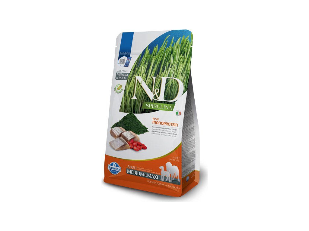 Produktová řada N&D Spirulina je novinka mezi krmivy pro domácí mazlíčky, kterou společnost Farmina vyvinula pro spokojenost a pohodu aktivních psů a koček. Díky obsahu spiruliny ("superpotravina"), která se vyznačuje celou řadou skvělých vlastností a obsahuje velké množství prospěšných živin, se jedná o krmivo, které ocení vysoce aktivní mazlíčci. Krmiva s označením Spirulina jsou vyrobena bez obilovin a obsahují více než 90 % bílkovin živočišného původu. Kompletní krmivo pro dospělé psy větších plemen (cca od 10 kg - střední a velká plemena).