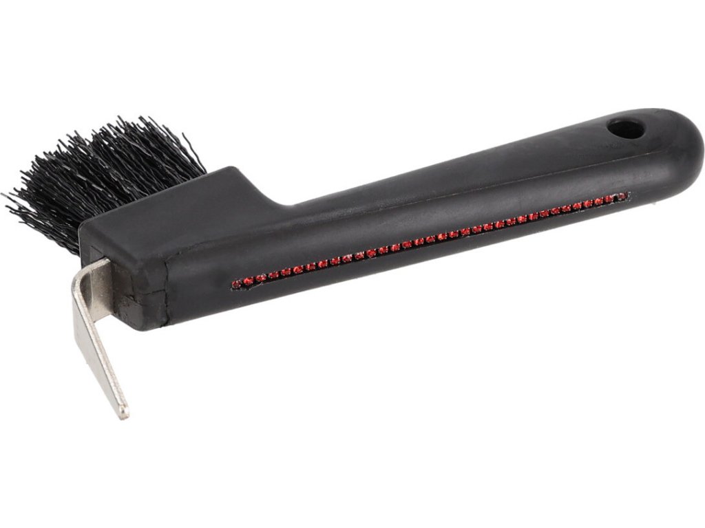 Kopytní háček zdobený červenými kamínky zaujme stylovým vzhledem i praktickým provedením. Je vybaven pevnou plastovou rukojetí pro pohodlný úchop a štětinami, které usnadňují důkladné čištění kopyt.