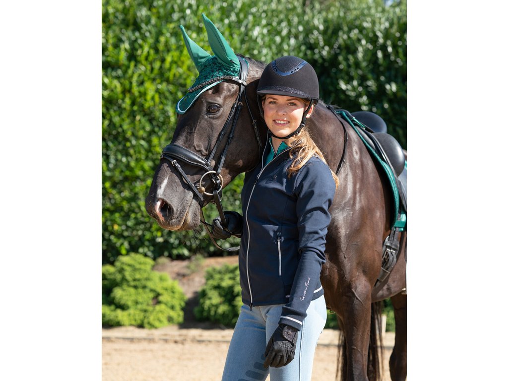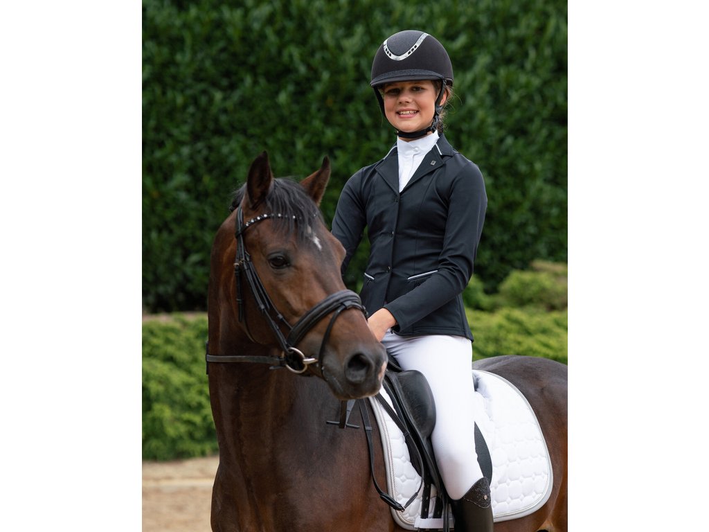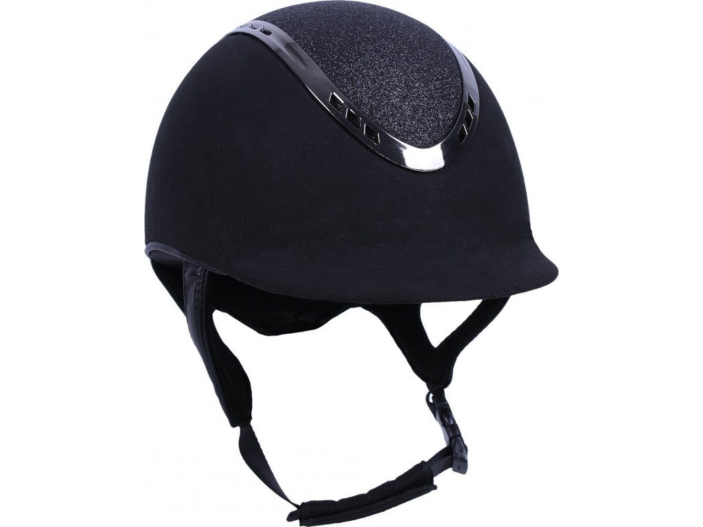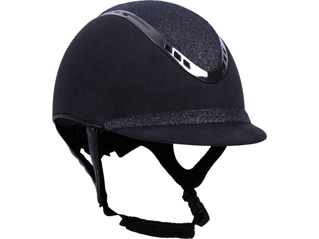 Bezpečnostní jezdecká přilba vyrobena z prodyšného polyesterového materiálu. S elegantním vzhledem, zdobena třpytkami. Vzhled přilby lze snadno změnit pomocí odnímatelného popruhu. Vybavena podšívkou z umělé kůže. Podšívka je pratelná v pračce a lze ji snadno připevnit na helmu pomocí suchého zipu. S nastavitelným páskem na bradě. Dodáváno se dvěma vložkami pro kulatý a oválný tvar hlavy. Vyrobena podle standardu VG1 01.040 2014-12.