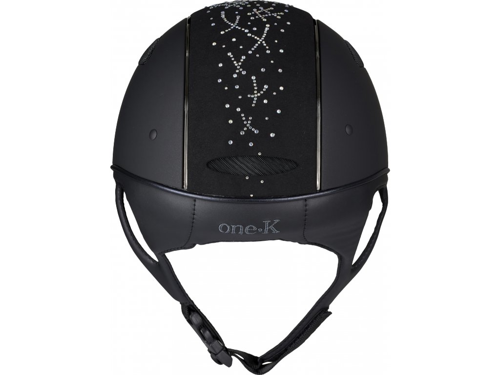 Jezdecká přilba One K™ s matnou úpravou s kamínky. Helmy One K™ se vyznačují nejmodernějším designem a také maximální bezpečností a pohodlím! Skládají se z pokročilého vstřikovaného vnějšího pláště z polykarbonátu a ABS kompozitu v kombinaci s EPS vložkou. Vložka EPS je klíčovou součástí, pokud jde o tlumení nárazů v přilbách. One K™ používá pouze ten nejkvalitnější EPS s hustotou, díky které jsou helmy perfektní pro tlumení nárazů (EPS - pěnový polystyren). Helma dále klade i vysoký důraz na pohodlí! Polstrované zapínání se syntetickou semišovou podšívkou na suchý zip s rychloupínací přezkou pro maximální komfort. Zapínání lze snadno nastavit dle potřeby. Disponuje také skvělým odvětrávacím systémem, čili je vhodná pro použití po celý rok. Vysokou urověň odvětrávání poskytují dva přední, dva boční, jeden zadní a dva středové větrací pruhy. One K™ se mohou dále pochlubit pokročilou technologií a estetickým designem. Na výběr jsou lesklé, matné, semišové, třpytivé a nebo zdobené krystaly Swarovski.. Možnosti těchto helem jsou nekonečné. Přilby One K™ jsou k dispozici ve třech velikostech. Schváleno VG01 a EN1382-2017. Helma je k dispozici pouze ve velikosti 2 - 56-60 cm.