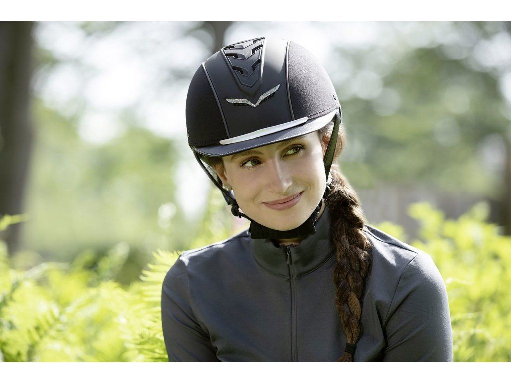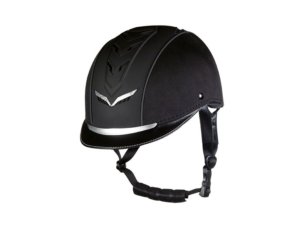Bezpečnostní jezdecká přilba v elegantním vzhledu. Helma je vyrobena z kombinace materiálů - plast, semiš a syntetická kůže s třpytivými detaily. Syntetický semiš je použitý po stranách a společně s kšiltem, který je potažený syntetickou kůží s bílým prošíváním dodává helmě nevšední vzhled. Dále má měkké odnímatelné polstrování Coolmax a středové větrací otvory zajišťující perfektní odvětrání. Možnost úpravy velikosti pomocí otočného kolečka. K dispozici více velikostí a barev. Dodávána v látkovém sáčku (100% polyester). Splňuje standard VG1 01.040 2014-12.