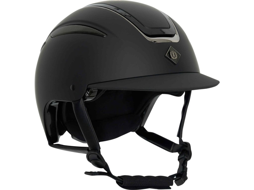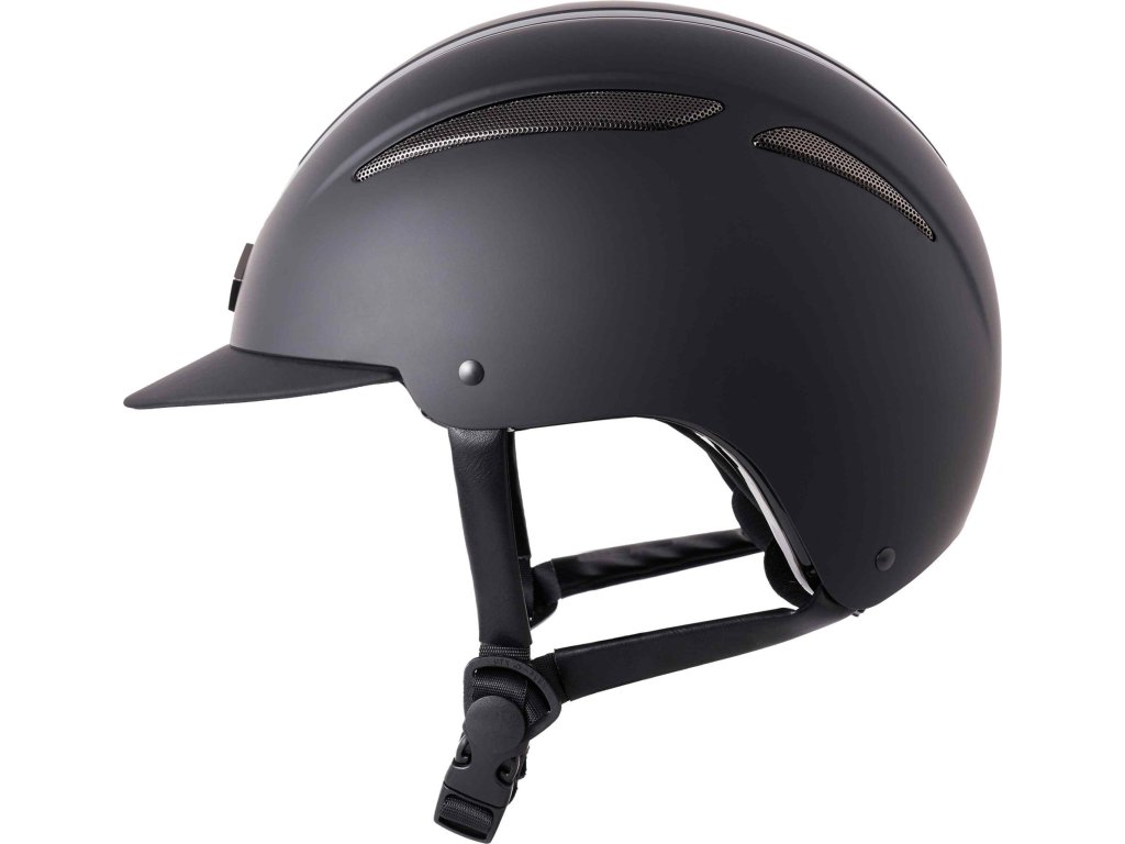 Elegantní jezdecká přilba s užším kšiltem vhodná pro všechny, kteří chtějí jezdit stylově a bezpečně. Zdobena lesklými detaily. Přilba je vybavena odvětrávacími otvory, které zajišťují cirkulaci vzduchu, chromovanými plastovými lemy a odolnou skořepinou z materiálu ABS pro spolehlivou ochranu. V zadní části je vybavena stahovacím kolečkem, díky kterému si velikost upravíte přesně dle vaší potřeby. Splňuje bezpečnostní normy VG1 01.040 2014-12 a EN 1384:2023, takže je vhodná pro sportovní i rekreační ježdění.