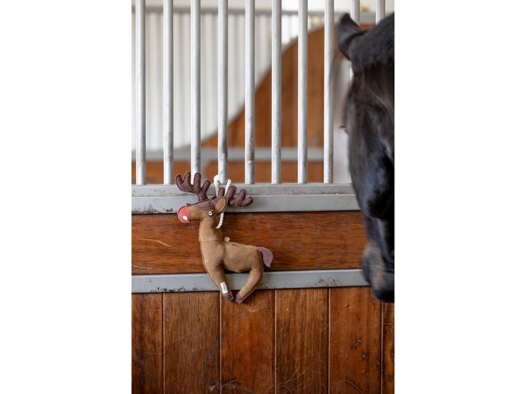 Zábavná hračka pro koně ve tvaru soba pomáhá předcházet nudě ve stáji. Vyrobena z odolné semišové kůže s vnitřní polyesterovou výplní. Bezpečně prošitá a snadno zavěsitelná pomocí připevněného provazu.