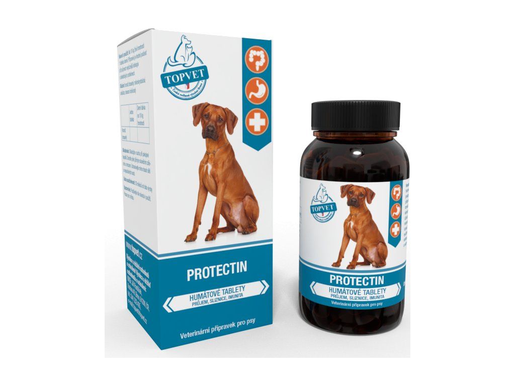 PROTECTIN - HUMÁTOVÉ TABLETY. PRŮJEM, SLIZNICE, IMUNITA. Veterinární přípravek pro psy. Humátové tablety PROTECTIN - účinnou látkou jsou přírodní huminové a fulvinové kyseliny. Podávání huminových kyselin prokazatelně snižuje projevy průjmů. Naše produkty jsou výhradně přírodního charakteru a výrazně posilují přirozené zažívání všech domácích mazlíčků. Při preventivním podávání 1x za 14 dní eliminujete výskyt průjmů na minimum. Druhým mechanismem účinku je vytvoření ochranného filmu na sliznici střeva, čímž je minimalizována adsorpce endogenních i exogenních toxinů z jeho lumina. Zlepšují metabolickou aktivitu organizmu, a tím zvyšují využitelnost živin. Vykazuje imunomodulační, profibrinolytickou, antikoagulační, antibakteriální a virucidní účinek. Tlumí mutace a nádorové bujení. Vykazuje estrogenní aktivitu.