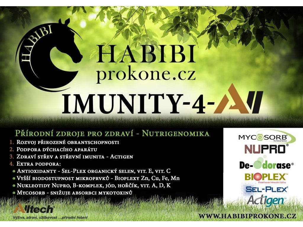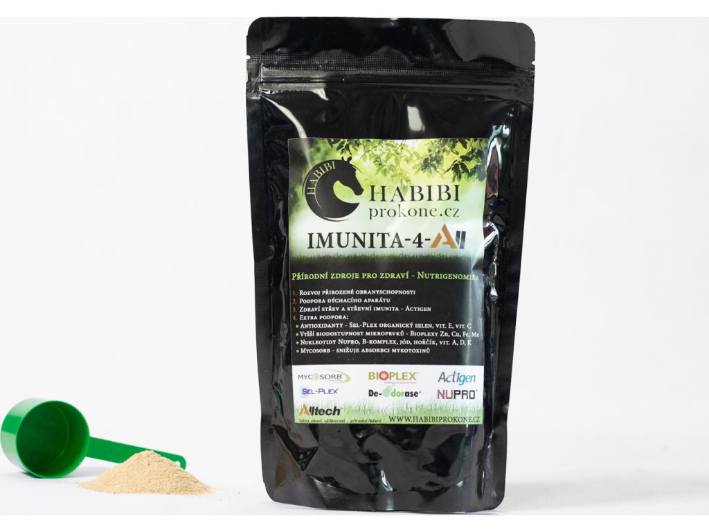 HABIBI-IMUNITA-4-ALL. Doplněk pro obohacení krmné dávky pro dobré zdolávání náročných životních období - jako prevence, ale i podpora organismu při nemoci, zátěži, stresu a také v rekonvalescenci a v období kolem porodu u matek i mláďat. Rozvoj přirozené obranyschopnosti, podpora zdravé antioxidační aktivity, podpora dýchacího aparátu, podpora zdraví střev a střevní imunity, podpora reprodukčních funkcí, podpora integrity tkání, podpora svalové tkáně a zvýšení odolnosti vůči zátěži. U mláďat přispívá ke zdravému růstu, k vývoji zdravého imunitního systému, podporuje střevní prostředí a normalizuje střevní mikroflóru a celkově přispívá ke zdravému trávení. Dostupné množství 0,5kg, 2,1kg, 4kg a 10kg. Složení: kvasnicné výrobky, juka, dihydrogenfosforečnan horečnatý, glukóza Analytické složky: hrubý protein 27 %, hrubá vláknina 1,3 %, hrubé oleje a tuky 3 %, hrubý popel 8,8 %.  Obsah doplňkových látek v 1kg: Stopové prvky: med (doplněna chelátem mědi a aminokyselin n-hydrátem, ALLTECH BIOPLEX Cu) 134 mg, mangan (doplněn chelátem manganu a aminokyselin n-hydrátem ALLTECH BIOPLEX Mn) 101 mg, zinek (doplnĚn chelátem zinku a aminokyselin n-hydrátem ALLTECH BIOPLEX Zn) 1005 mg, selen (doplněn selenomethioninem ze Saccharomyces cerevisiae CNCM I-3060, ALLTECH SEL-PLEX) 10 mg, jód (doplněno jodicnanem vápenatým bezvodým) 19 mg; Vitamíny, provitamíny a chemicky přesně dfinované látky se srovnatelným úcinkem: vit. A 800000 m.j., vit. D3 60000 m.j., vit. E (RRR-alfa-tokoferol) 500 mg, vit. B1 400 mg, vit. B2 152 mg, vit. B6 254 mg, vit. B12 60 μg, vit. C 10000 mg, biotin 20 mg, niacinamid 1100 mg, kyselina listová 20 mg, pantothenan v.penatý 800 mg, vit. K 20 mg. Způsob užívání: Zamíchejte do zvlhčeného krmiva, do jogurtu nebo do nápoje. Pro zvýšení chutnosti možno dochutit oblíbenou složkou potravy. Pro nejlepší efekt podávejte alespoň po dobu 6 - 8 týdnů. Je možno podávat i dlouhodoběji. U malých zvířat (pes, kočka) a hříbat pod matkou stačí Habibi IMUNITA-4-All jako jediný doplněk vitamínů a minerálů. U odstavených hříbat, rostoucích mladých koní a u dospělých koní doporučujeme podávat Habibi IMUNITU-4-All jako doplněk k základní minerální směsi Habibi-Organika. Pokud kůň odmítá novou chuť a aroma, začněte podáváním menších dávek v oblíbeném krmivu a zvlhčováním studenou vodou (teplá uvolňuje aroma více). Odmítání nových aromat a chutí je přirozená reakce koně na neznámé složky krmné dávky a Váš kůň potřebuje čas na zvyknutí. Dávkování: Pro pohodlnější nastavení dávky můžete použít objemové odměření: 10ml = 7 gramů Odměrka 50 ml = 35 gramů 1 polévková lžíce vrchovatá (s kopcem) = 20 gramů 1 čajová lžička vrchovatá s kopcem = 6 gramů 1 čajová lžička zarovnaná = 2 gramy
