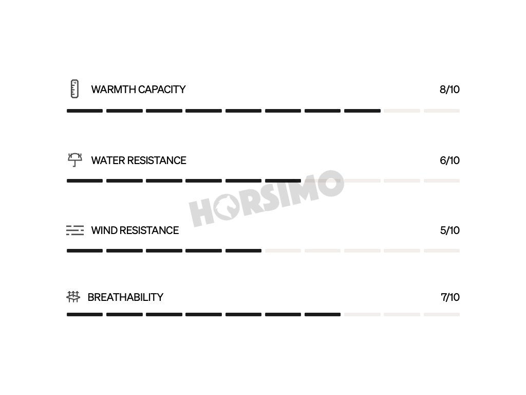 Pečlivě vybrané materiály jsou vhodné do chladného počasí, tak i do srážek nebo hustého sněžení. Tkanina vydrží také nepříznivé povětrnostní podmínky. Výplň vyrobena ze syntetického materiálu Sorona See Pro. Izolace je velmi obdobná pravému prachovému peří. Sorona See Pro materiál navíc udržuje teplo i za vlhkých podmínek a velmi rychle schne.