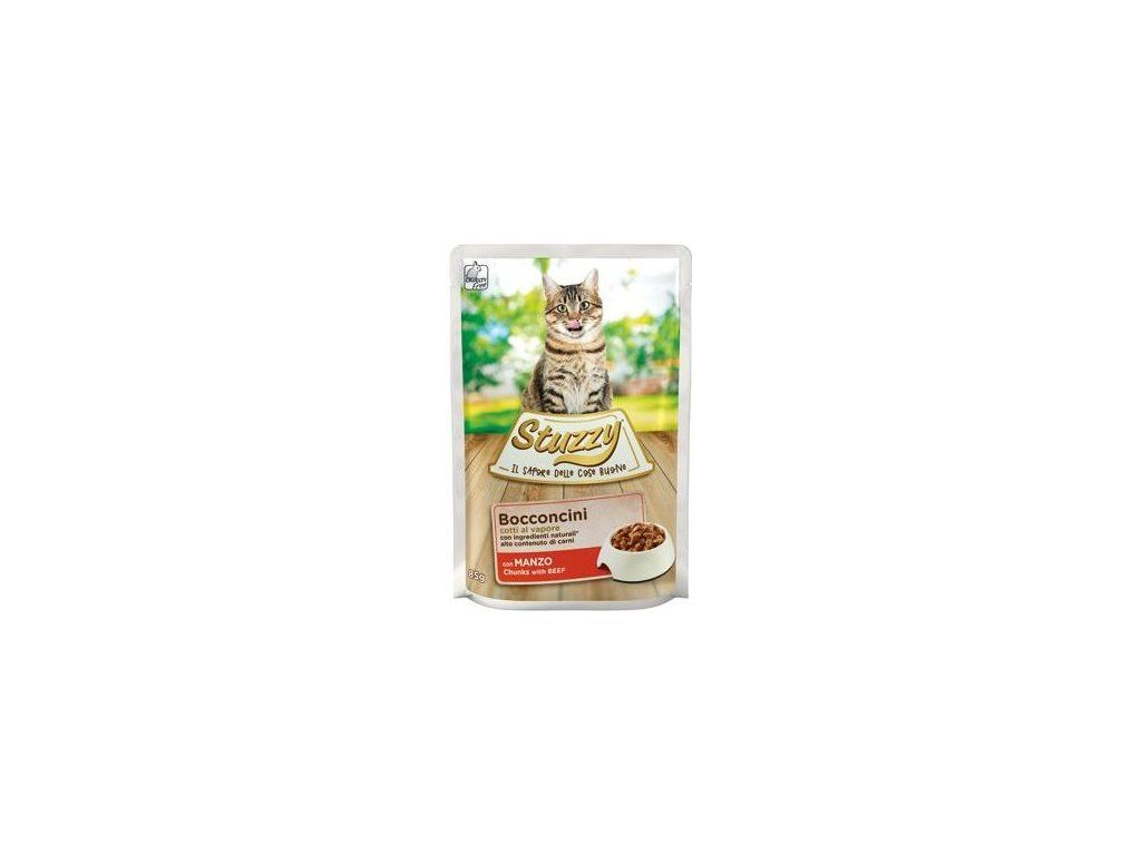 Vlhké krmivo pro dospělé kočky s hovězí příchutí je speciálně připravováno v páře. Italské kapsičky Stuzzy zachutnají i té nejmlsnější kočičce. Složení kapsičky je speciálně upraveno tak, aby splňovalo výživové požadavky dospělých koček. Kapsičky označené jako Bocconcini obsahují pouze pomalu vařené přírodní ingredience a jsou bohaté na chuť a živiny (jedinečný zážitek skutečné chuti).