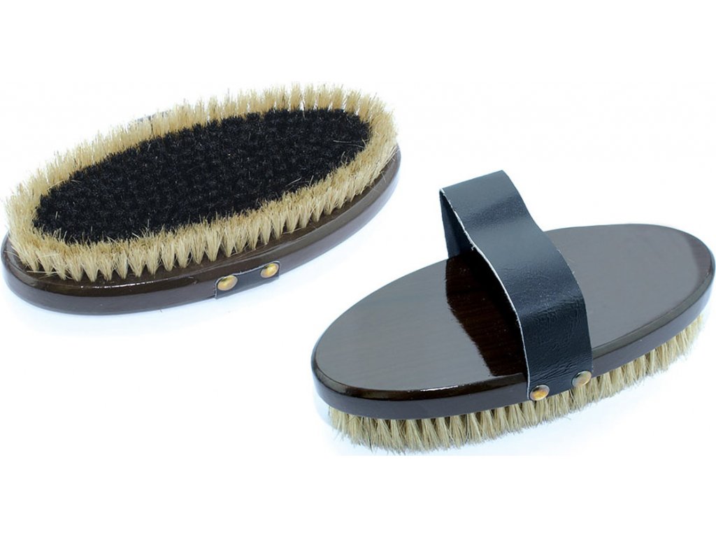 Kvalitní kartáč s lakovaným dřevěným hřbetem, koženým poutkem a jemnými štětinami. Po obvodu kartáče vybaven světlými pevnějšími a delšími štětinami. Kratší štětiny jsou vhodné pro jemné čištění a delší štětiny pro odstraňování prachu a zanechání lesklého efektu.