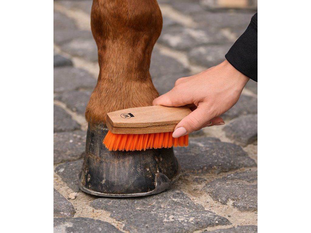 Kvalitní kartáč na kopyta, má silné syntetické štětiny v přírodní dřevěné páteři. K dispozici ve více barvách.