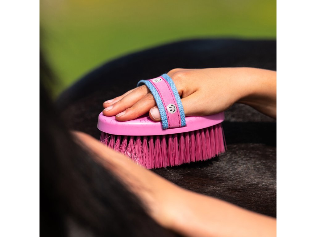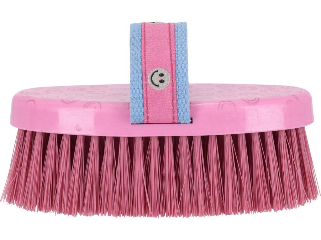 Kvalitní kartáč s měkkými štětinami účinně odstraňuje nečistoty ze srsti koně a zároveň je šetrný. Je opatřen plastovou rukojetí a nylonovým páskem pro pohodlné a bezpečné držení. Kartáč zdobí roztomilý potisk smajlíků.