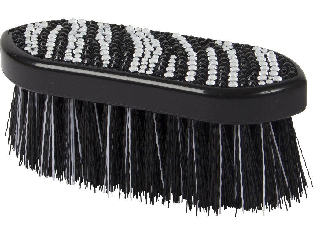 Černý rýžový kartáč, zdobený černými a bílými kamínky v zebrovaném motivu.