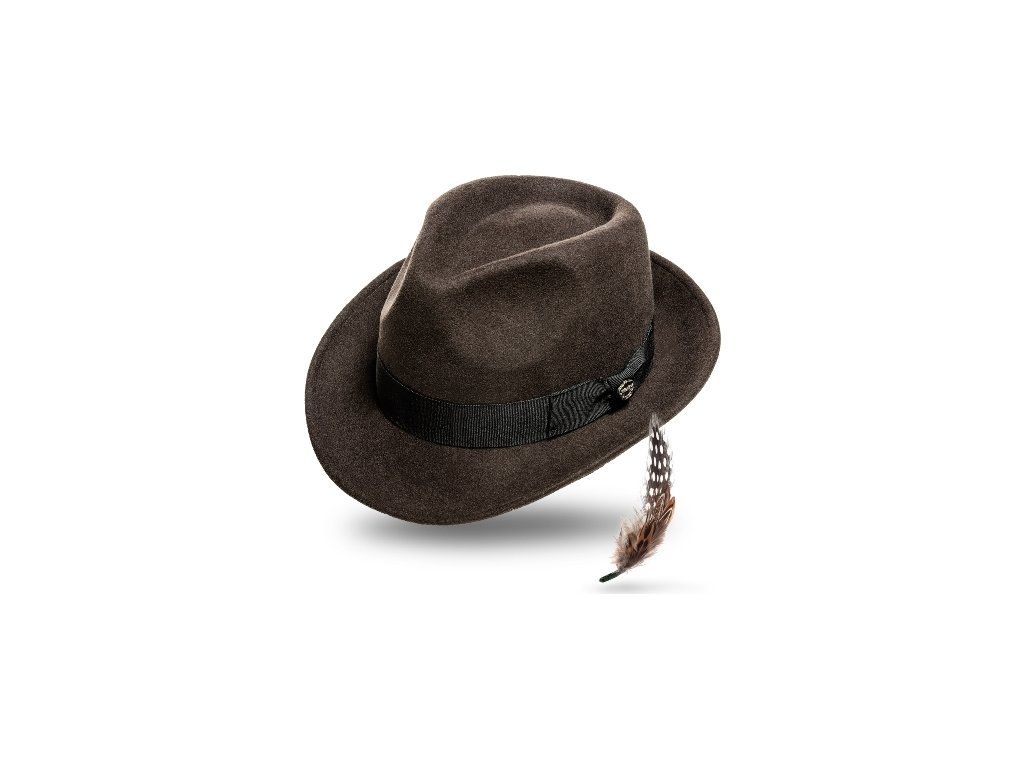 Kvalitní klobouk z vlněné plsti s vnitřní příjemnou podšívkou. Opatřený je jednoduchou stuhou se stříbrným plíškem a ozdobným pírkem. Vnitřní strana klobouku je vybavena nastavitelným páskem. Speciálně upravený materiál, který je odolný vůči vlhkosti a znečištění.
