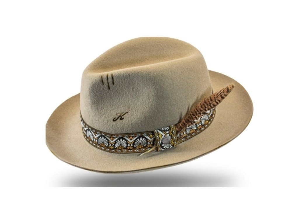 Kvalitní klobouk z vlněné plsti s vintage vzhledem a ozdobným páskem. Jedná se o stylový doplněk ve vysoké kvalitě. Pevný a odolný materiál, který je navíc nepromokavý. Vnitřní strana je vybavena nastavitelným páskem a klobouk je snadné přizpůsobit požadovanému obvodu hlavy. Šířka okraje: 6,5 cm, výška koruny: 10 cm. Jedná se o kvalitní ruční výrobu.