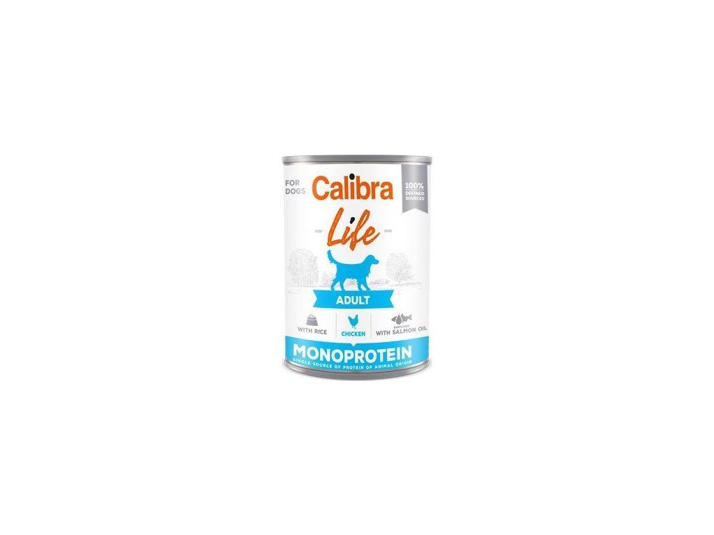 Calibra Dog Life Adult Chicken with Rice: receptura konzervy s kuřetem, kuřecími srdíčky a rýží je kompletním krmivem, která je určená pro dospělé psy. Recepturaje založena na jediném druhu proteinu, je sestavena z omezeného počtu ingrediencí. Složení konzervy je bezlepkové, bez pšenice, sóji, GMO,obsahuje jen suroviny té nejvyšší kvality, které jsou ze 100% definovaných zdrojů, což spolu s nízkým obsahem rýže má vliv na lehkou stravitelnost. Receptura obsahuje lososový olej, který je bohatým zdrojem nenasycených mastných kyselin omega-3 (EPA, DHA) potřebných pro vývoj a funkci mozku, podporu fyziologické funkce kůže a srsti a jejich kvality. Mají také protizánětlivý účinek. Složení: kuře (40 %), kuřecí srdce (30 %), rýže (4 %), hrachová mouka, lignocelulóza, lososový olej (1 %), uhličitan vápenatý.