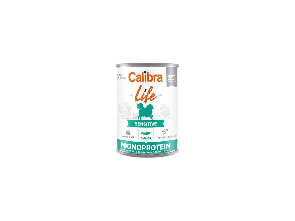 Calibra Dog Life Sensitive Salmon with Rice: receptura konzervy s lososem a rýží je kompletním krmivem, které je určené pro dospělé psy a vhodné i pro citlivé zažívání. Hypoalergenní receptura je založena na jediném druhu proteinu, je sestavena z omezeného počtu ingrediencí. Složení konzervy je bezlepkové, bez pšenice, sóji, GMO,obsahuje jen suroviny té nejvyšší kvality, které jsou ze 100% definovaných zdrojů, což spolu s nízkým obsahem rýže má vliv na lehkou stravitelnost. Receptura obsahuje lososový olej, který je zdrojem nenasycených mastných kyselin omega-3 (EPA, DHA) potřebných pro vývoj a funkci mozku, na podporu fyziologické funkce kůže a srsti a jejich kvality. Omega-3 mají také protizánětlivý účinek. Schizochytrium limacinum (sušené řasy) jsou zdrojem omega 3 mastné kyseliny DHA, která přispívá k normální funkci mozku. Složení: losos (70 %), rýže (4 %), hrachová mouka, lignocelulóza, lososový olej (1 %), uhličitan vápenatý, sušené řasy (0,2 %, Schizochytrium limacinum).