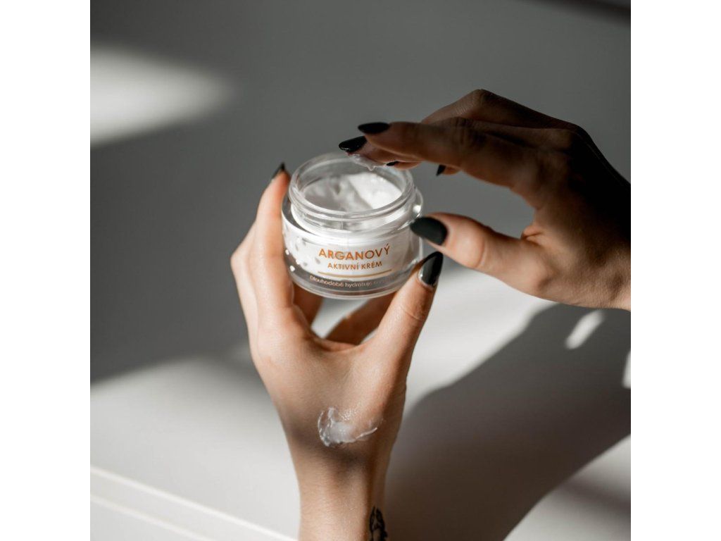 ARGANOVÝ AKTIVNÍ KRÉM. Dlouhodobě hydratuje a vyživuje. Arganový krém obsahuje vysoký podíl arganového oleje. Ten je pro své výjimečné vlastnosti často nazýván marockým zlatem. Patří mezi nejluxusnější a zároveň nejdražší kosmetické oleje světa. Aktivní krém je bohatým zdrojem nenasycených mastných kyselin, antioxidantů, vitamínů a fytosterolů. Tlumí projevy stárnutí, redukuje výskyt vrásek, hydratuje a pomáhá udržet pokožce mladistvý vzhled.
