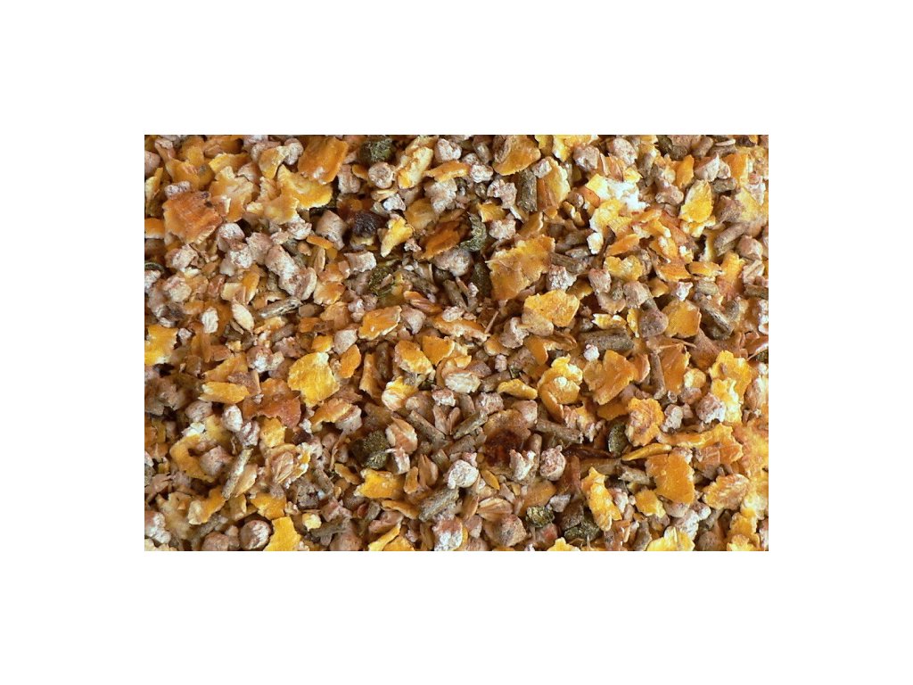 Složení: kukuřice vločkovaná hydrotermicky ošetřená, pšenice extrudovaná, úsušky vojtěšky, pšeničné otruby, Ječmen vločkovaný hydrotermicky ošetřený, vitamínově-minerální premix, jablečné výlisky, melasa řepná, cukrovkové řízky, sladový květ, vinné výlisky, syrovátka, rýžové otruby, lněné semeno.