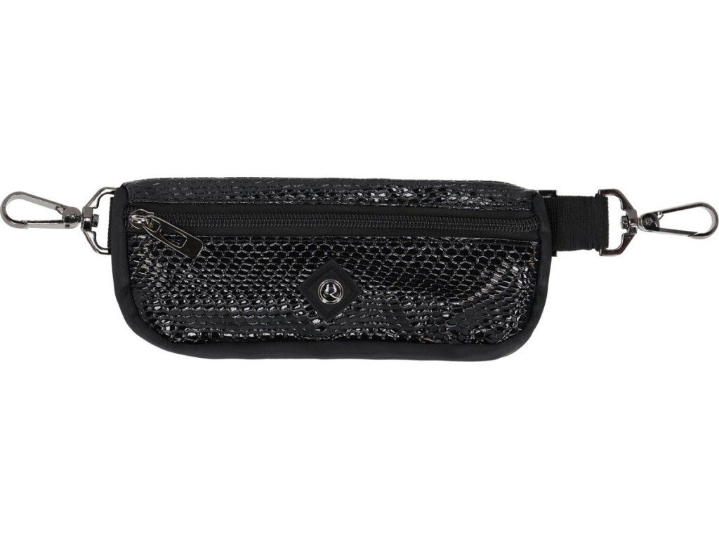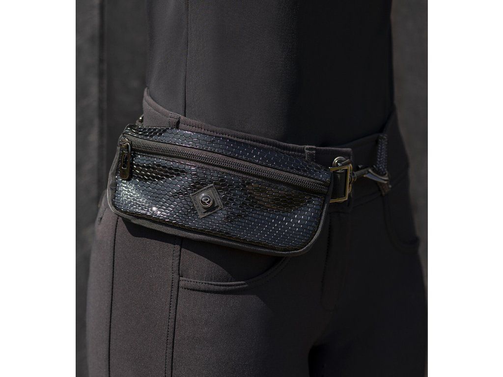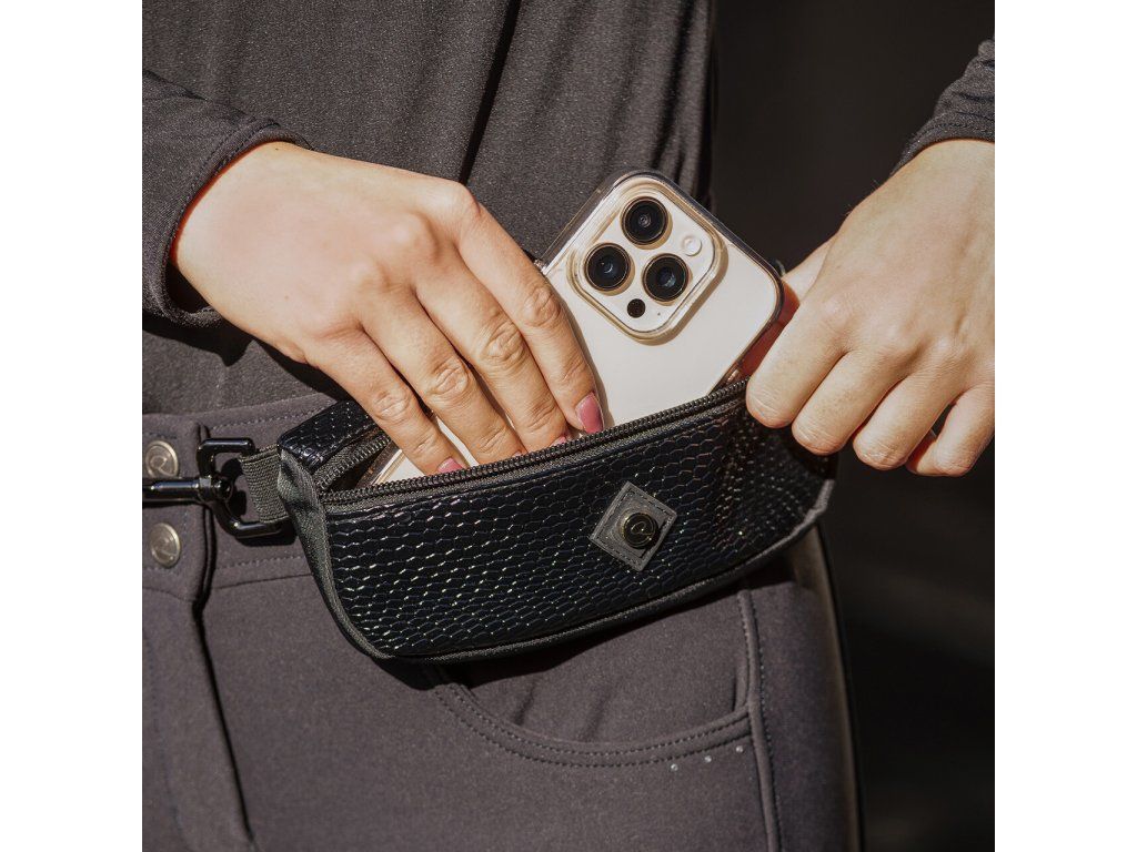 Elegantní ledvinka s krokodýlím potiskem, která se pomocí karabinek snadno upevní na poutka jezdeckých rajtek či legín. Nabízí praktický prostor na mobilní telefon. Zapínání na zip poskytuje snadný a rychlý přístup.