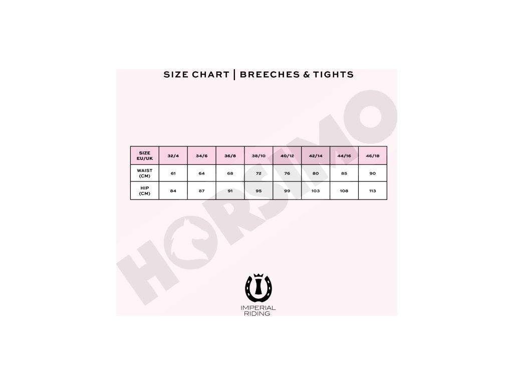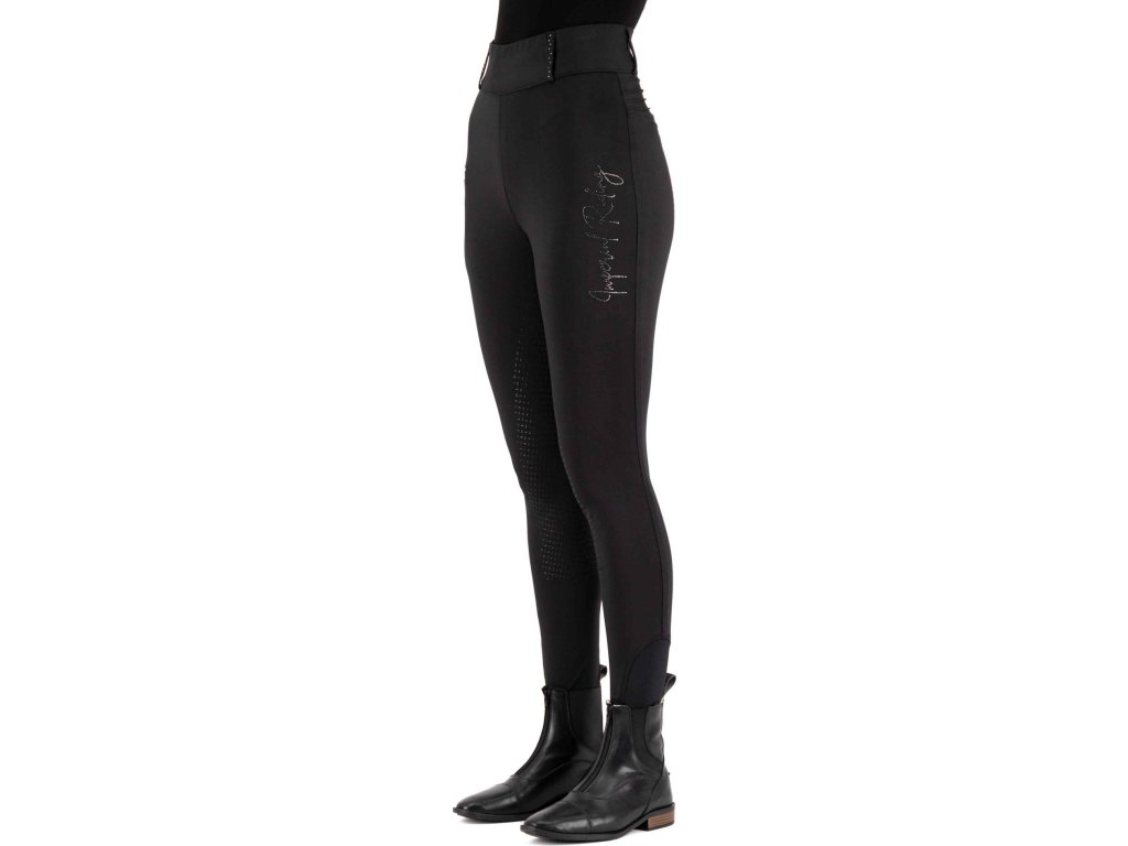 Jezdecké legíny, které jsou vyrobeny z měkké a prodyšné tkaniny. Čtyřsměrný strečový materiál umožňuje maximální volnost pohybu a pohodlí, zatímco silikonový grip podél celé délky sedu zajistí stabilní sed v sedle. Mají poutka na opasek a kapsu na telefon podél stehna. Zdobeny decentními kamínky, třpytkami a řasením v zadní části. Vysoký pas podtrhuje ženskou siluetu a poskytuje pohodlí při jízdě.