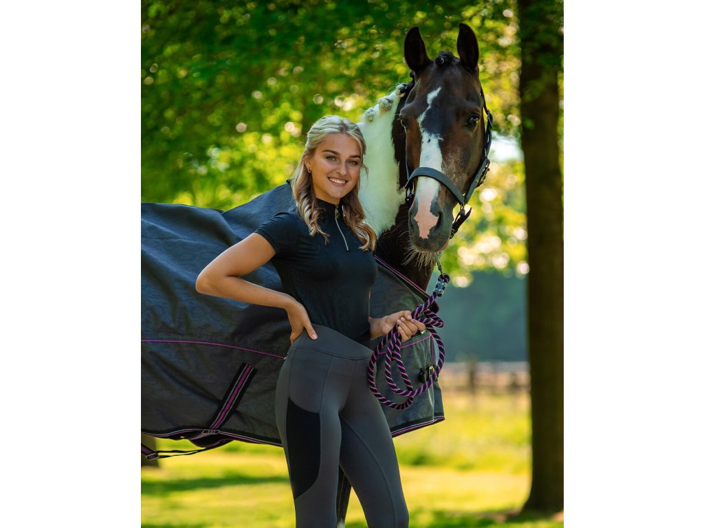 Dámské jezdecké legíny s protiskluzovým silikonovým gripem. Pružný materiál společně s vysokým elastickým pasem s žebrovaným detailem poskytuje maximální pohodlí při nošení i během jízdy. Opatřeny jsou praktickou hlubokou kapsou, která je ideální na mobilní telefon. Nohavice jsou zakončeny lycrou. Díky použitému materiálu jsou tyto legíny ideální na léto. Skvěle ladí k ostatním produktům z kolekce Djune.
