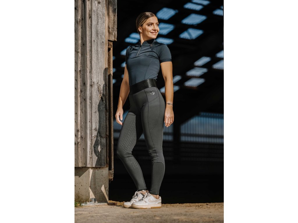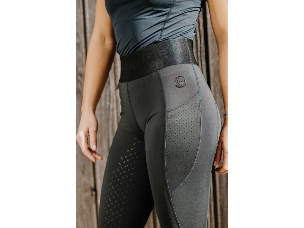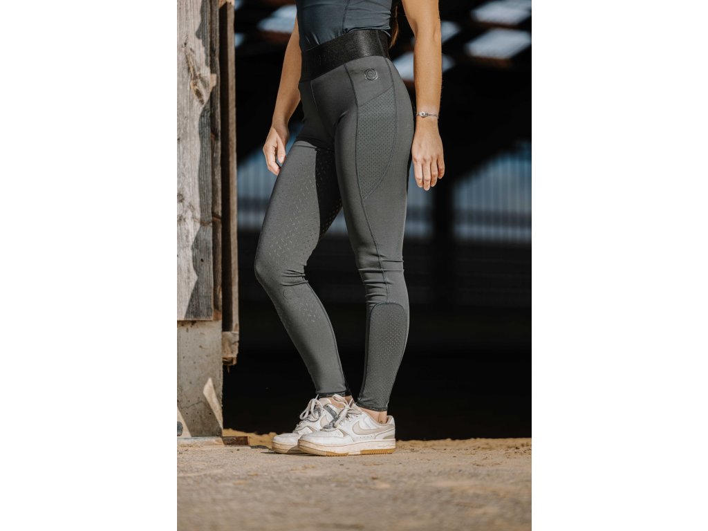 Tyto funkční jezdecké legíny představují dokonalou kombinaci pohodlí, odolnosti a stylu. Jsou vyrobeny z rychleschnoucí, prodyšné tkaniny se silikonovým gripem po celé délce sedu, který poskytuje lepší přilnavost a jistotu v sedle. Díky strečovému a lehkému materiálu se přizpůsobí každému pohybu a zaručují maximální volnost i při náročném tréninku. Speciální tkanina, která odvádí vlhkost s chladicí technologií udržuje příjemnou teplotu, zatímco kontrastní síťovinové panely na bocích a spodní části legín zvyšují prodyšnost a dodávají moderní vzhled. Elastický pas zajišťuje pohodlné nošení, boční kapsy umožňují uložení telefonu a spodní část nohavic je zakončena lycrou.