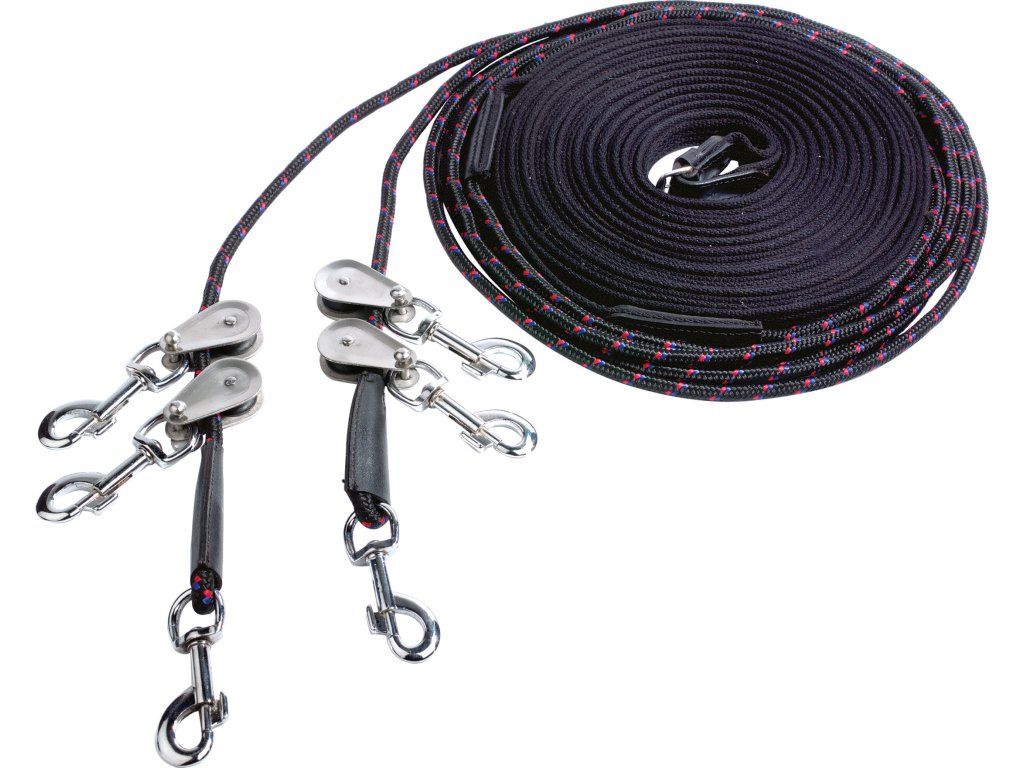 Dvojitá lonž s kladkami, vyrobena z bavlněného materiálu. Nylonový kulatý popruh je zakončený otočnými karabinami a čtyřmi kladkami. Nylonový popruh je dlouhý 3m. Celková délka lonže: 18m.