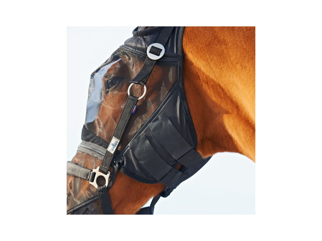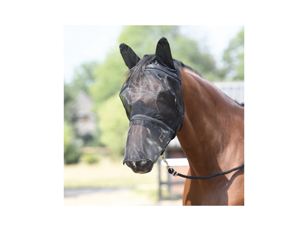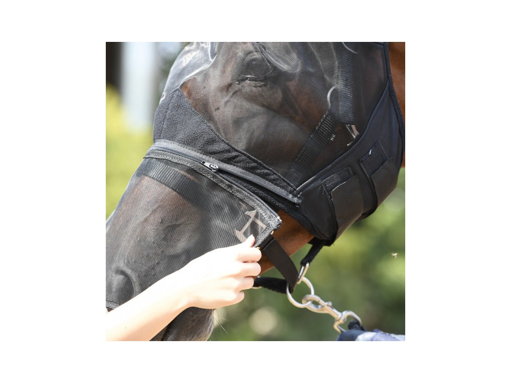 Maska proti hmyzu s odnímatelnou ochranou nozder díky zipu. Je vyrobená z jemného síťovaného materiálu. Oční část má vyvýšený prostor. Ochrana uší je z extra měkkého materiálu. Zapínání masky pomocí dvou širokých suchých zipů. Všechny okraje jsou lemovány měkkým fleecem, navíc oblast čelenky umělou kožešinou. Vždy se ujistěte, aby byla maska proti hmyzu správně nasazená!