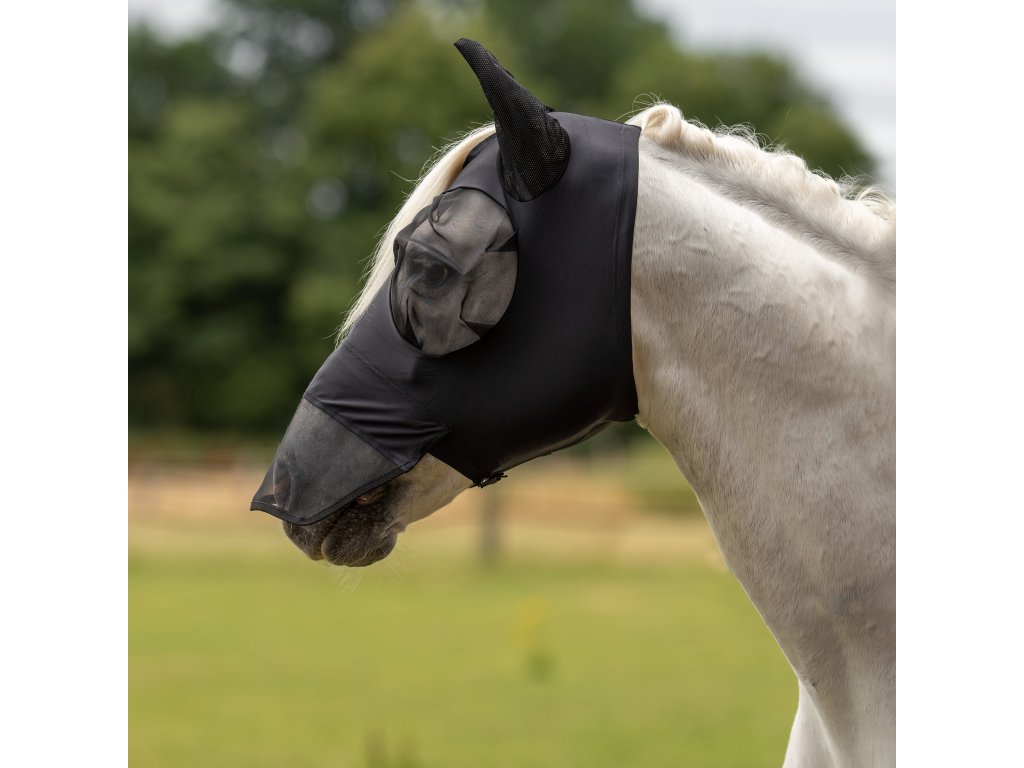 Kvalitní maska proti hmyzu s ochranou očí, uší a nozder z elastického a prodyšného materiálu. Síťovina v oblasti očí poskytuje dostatek prostoru. Pevně integrovaná ochrana nozder zajišťuje spolehlivou ochranu, navíc je tato část velikostně nastavitelná. Díky elastickému materiálu se maska snadno přizpůsobí tvaru koňské hlavy. Snadné zapínání pomocí YKK® zipu umístěným centrálně podél spodní čelisti. Zapínání je jemně polstrované a dodatečně zajištěné proti rozepnutí a odření. Maska klade vysoký důraz na pohodlí a účinnou ochranu proti hmyzu. Vždy se ujistěte, aby byla maska proti hmyzu správně nasazená!