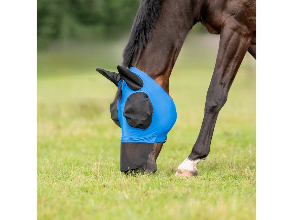 Kvalitní maska proti hmyzu s ochranou očí, uší a nozder z elastického a prodyšného materiálu. Síťovina v oblasti očí poskytuje dostatek prostoru. Pevně integrovaná ochrana nozder zajišťuje spolehlivou ochranu, navíc je tato část velikostně nastavitelná. Díky elastickému materiálu se maska snadno přizpůsobí tvaru koňské hlavy. Snadné zapínání pomocí YKK® zipu umístěným centrálně podél spodní čelisti. Zapínání je jemně polstrované a dodatečně zajištěné proti rozepnutí a odření. Maska klade vysoký důraz na pohodlí a účinnou ochranu proti hmyzu. Vždy se ujistěte, aby byla maska proti hmyzu správně nasazená!