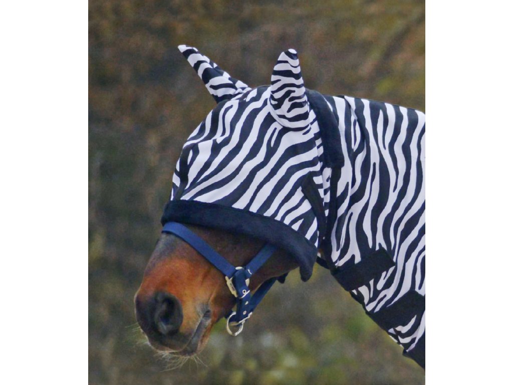 Velmi efektní maska proti hmyzu se vzorem "zebra". Měkce polstrovaná nad nozdrami a za ušima. Zapínání pomocí suchého zipu.