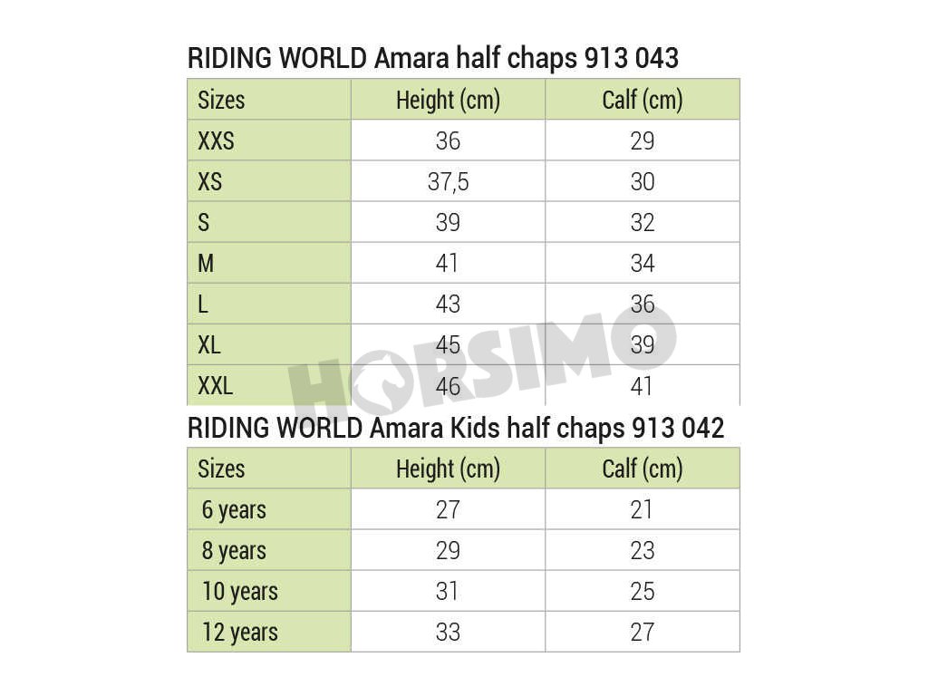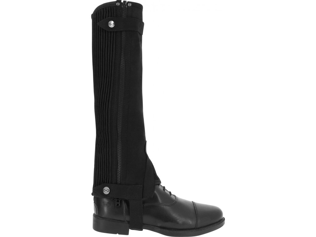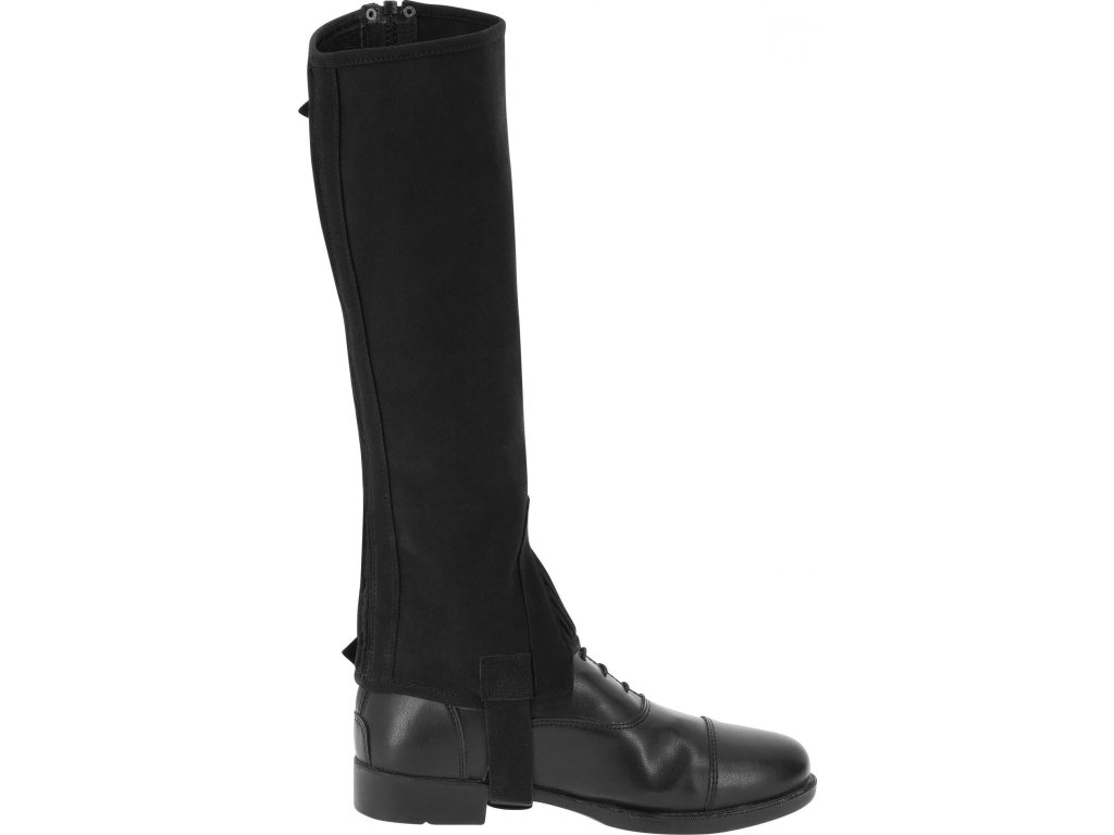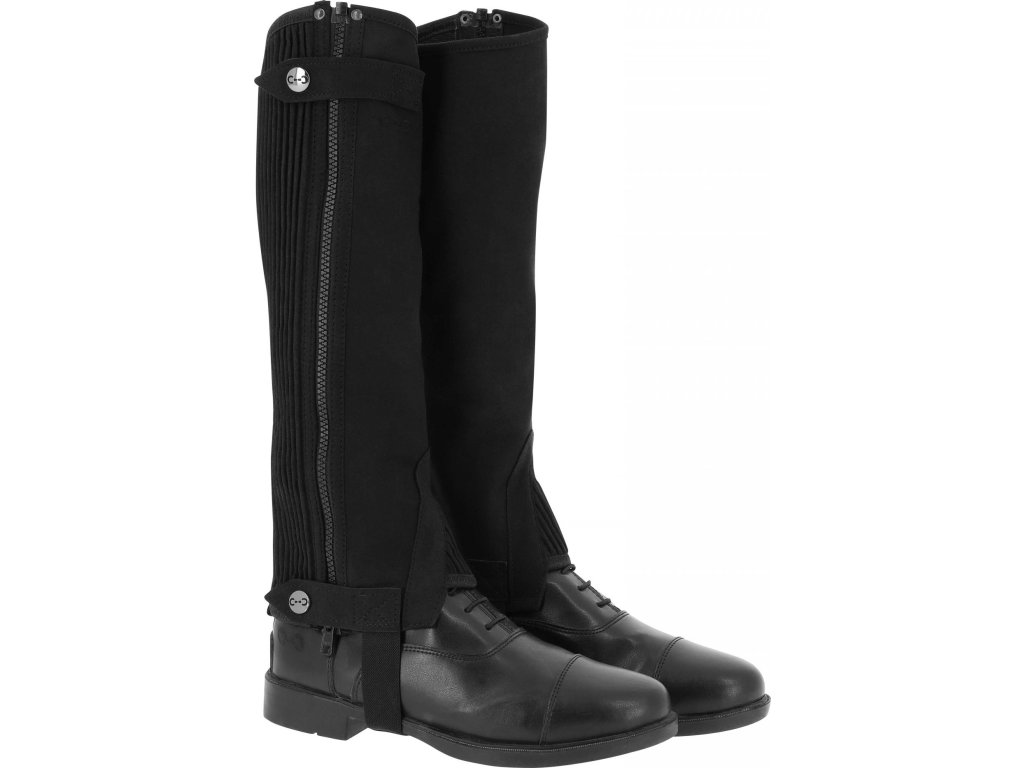 Jezdecké minichapsy vyrobené ze syntetického materiálu Amara, který je velmi pevný, tenký a stále pružný. Tento syntetický materiál zajišťuje odolnost proti opotřebení, přizpůsobivost tvaru nohy a pohodlí při jízdě. Zadní část lýtek a nárty jsou vybaveny elastickým materiálem, který poskytuje lepší přizpůsobení a volnost pohybu. Praktický zadní zip je doplněn zapínáním na druky. Minichapsy jsou vybavené elastickými páskami pod chodidlem, které zajišťují stabilní usazení.
